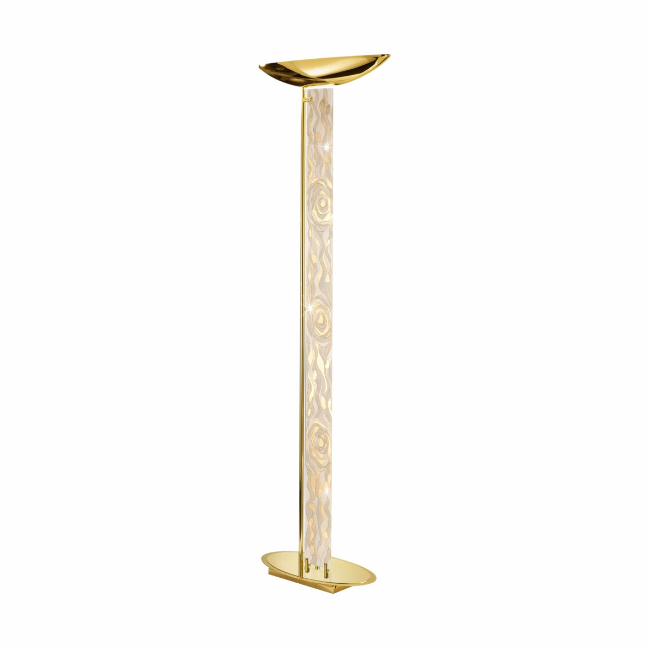 Напольный торшер выполнен с основанием и верхним отражателем из 24-каратного золота, высота конструкции 185 см, ширина 26 см и длина 60 см. Вертикальный стержень украшен ручной росписью Aqua Champagne с декоративным узором, покрытой листовым золотом. Конструкция оснащена двумя лампами с цоколем R7s длиной 118 мм, направляющими свет вверх для рассеянного освещения потолка и верхней зоны помещения. На фото видно, что торшер предназначен для установки на пол, создавая локальное и акцентное освещение, а декоративная отделка превращает его в выразительный художественный элемент интерьера, совмещая функциональность и декоративность.