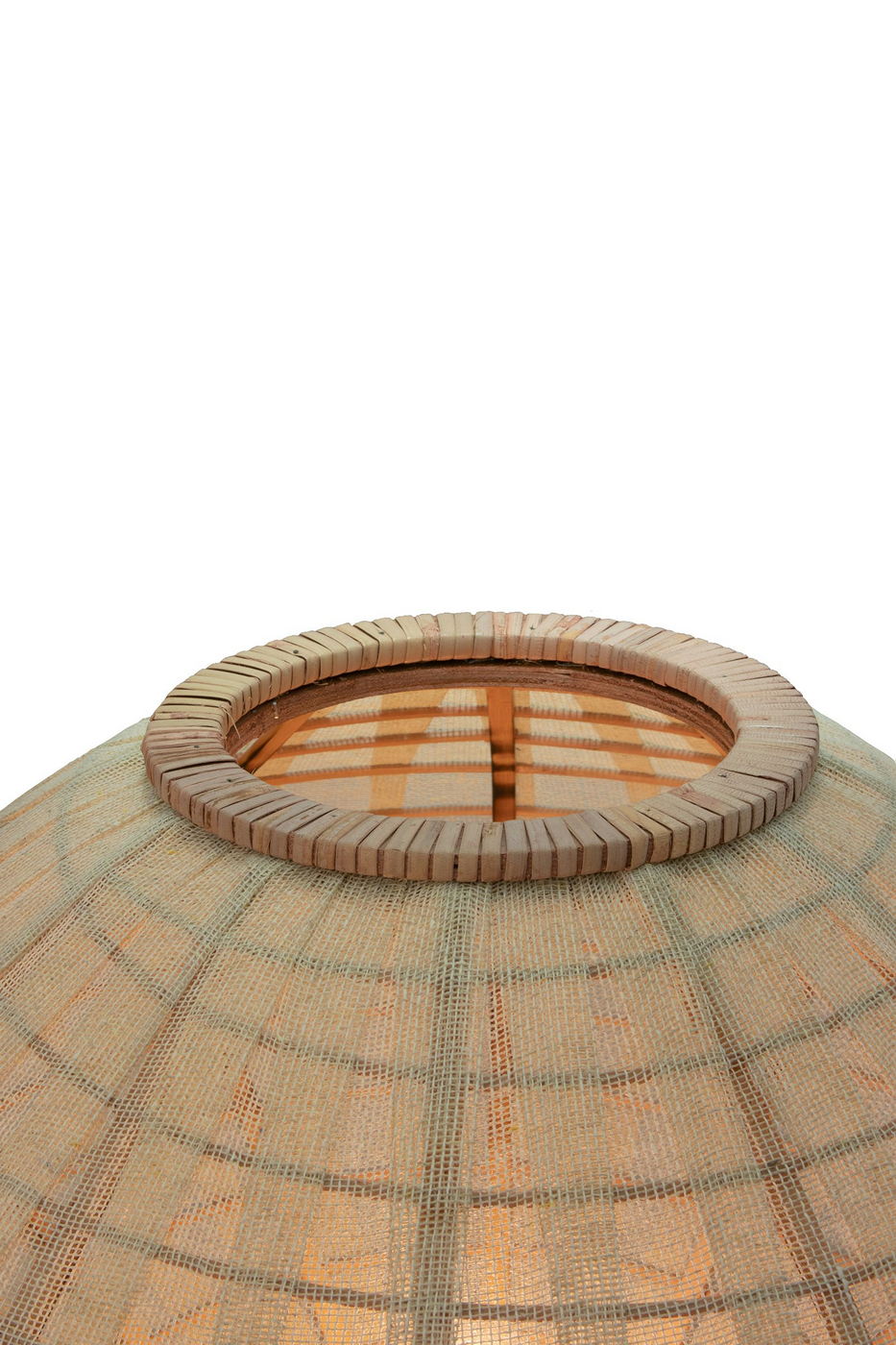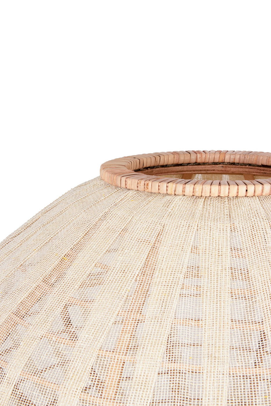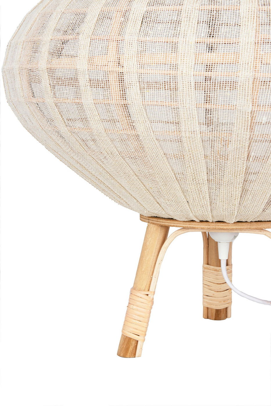 Настольный светильник с крупным плетёным плафоном предназначен для рассеянного освещения и размещения на полу или мебели благодаря устойчивой конструкции на трёх ножках. Корпус выполнен из ротанга и льна, образующих сферическую форму диаметром около 50 см и высотой 48 см, через которую свет проходит сквозь текстильную структуру. Внутри используется лампа с цоколем E27 мощностью до 60 Вт, при этом лампа не входит в комплект. Основание из трёх опор приподнимает плафон над поверхностью, а подключение осуществляется через текстильный кабель длиной около 2 м с выключателем. Степень защиты IP20 допускает использование только в помещении.