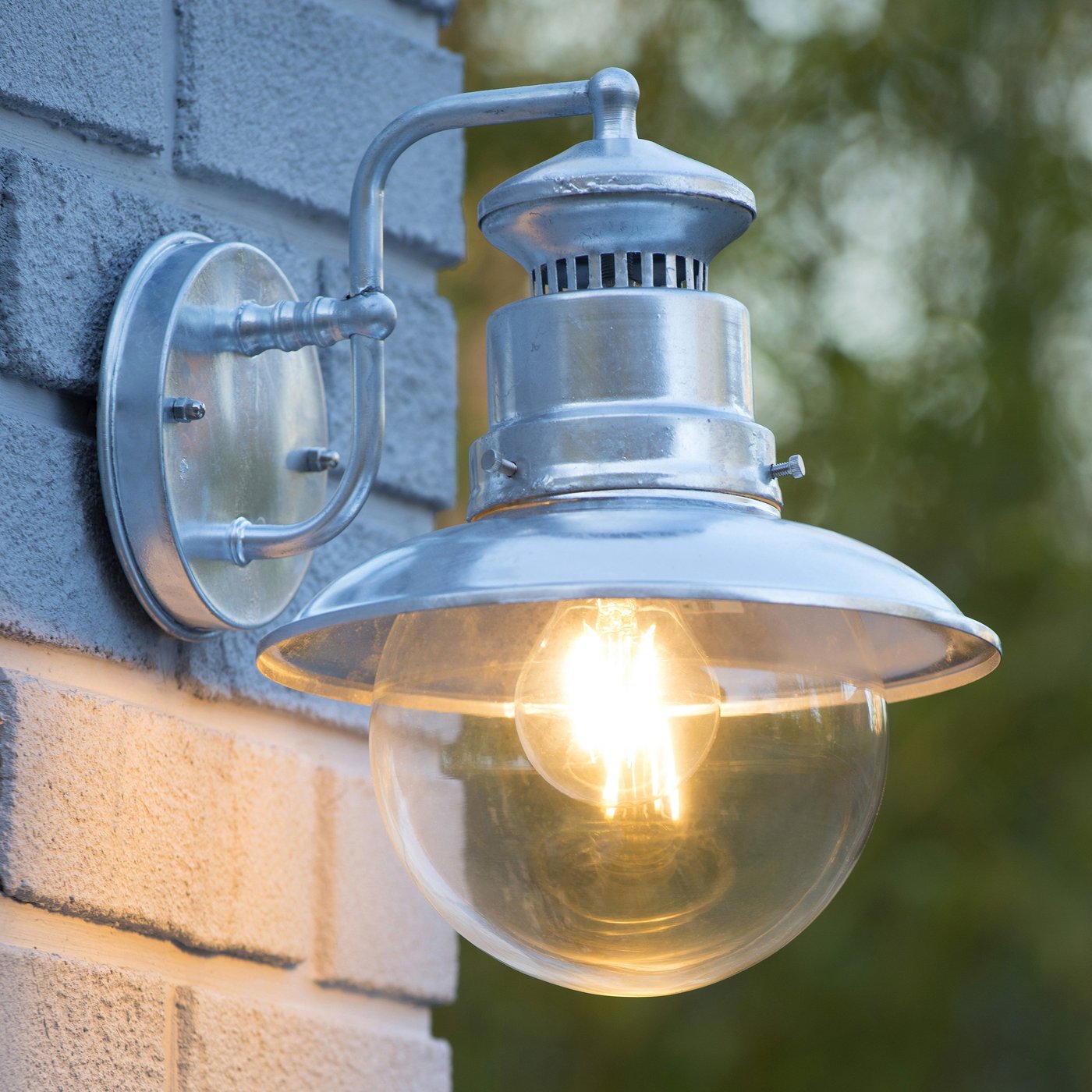 уличный настенный светильник с округлым плафоном и металлическим козырьком серебристого цвета
