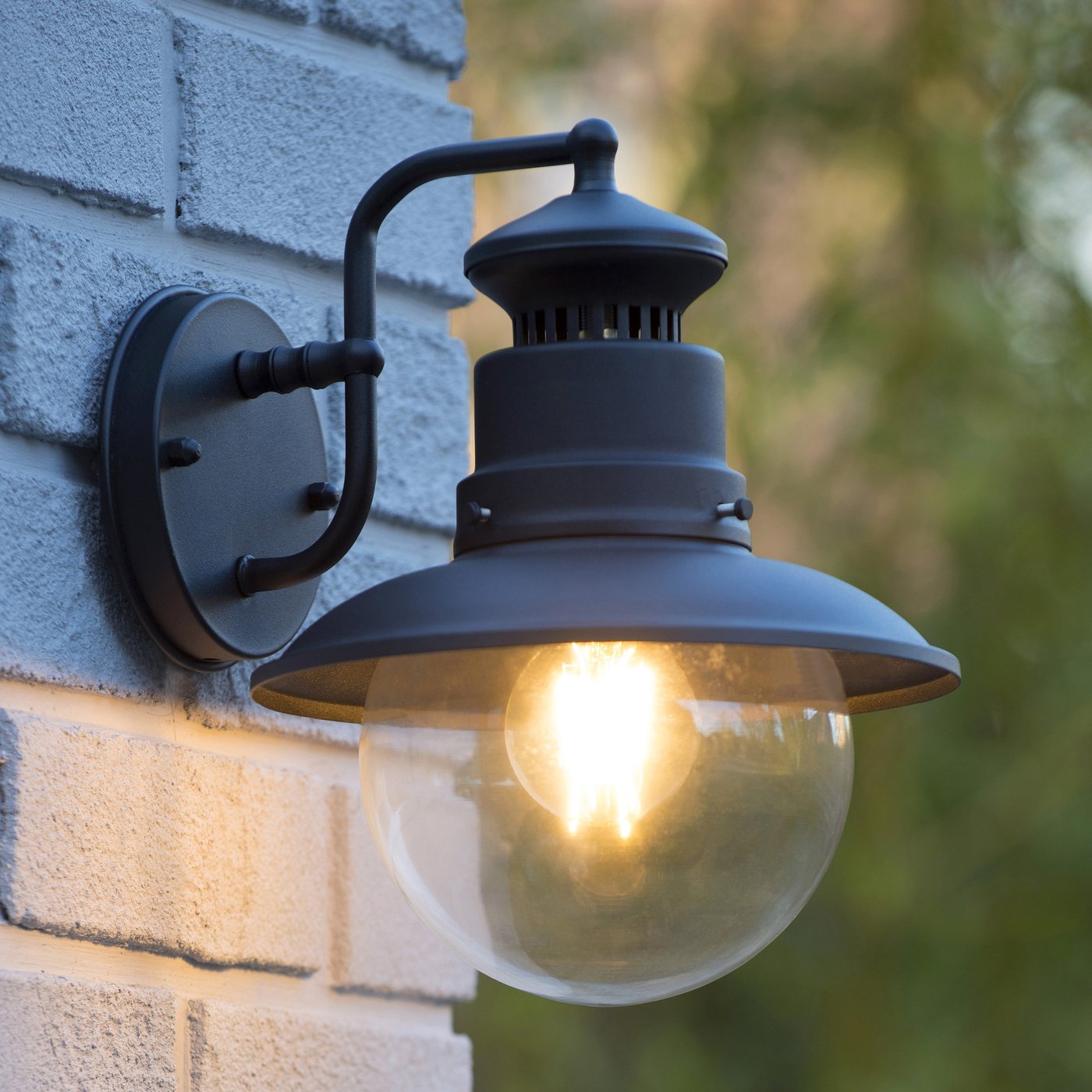 уличный настенный светильник с округлым плафоном и металлическим козырьком чёрного цвета