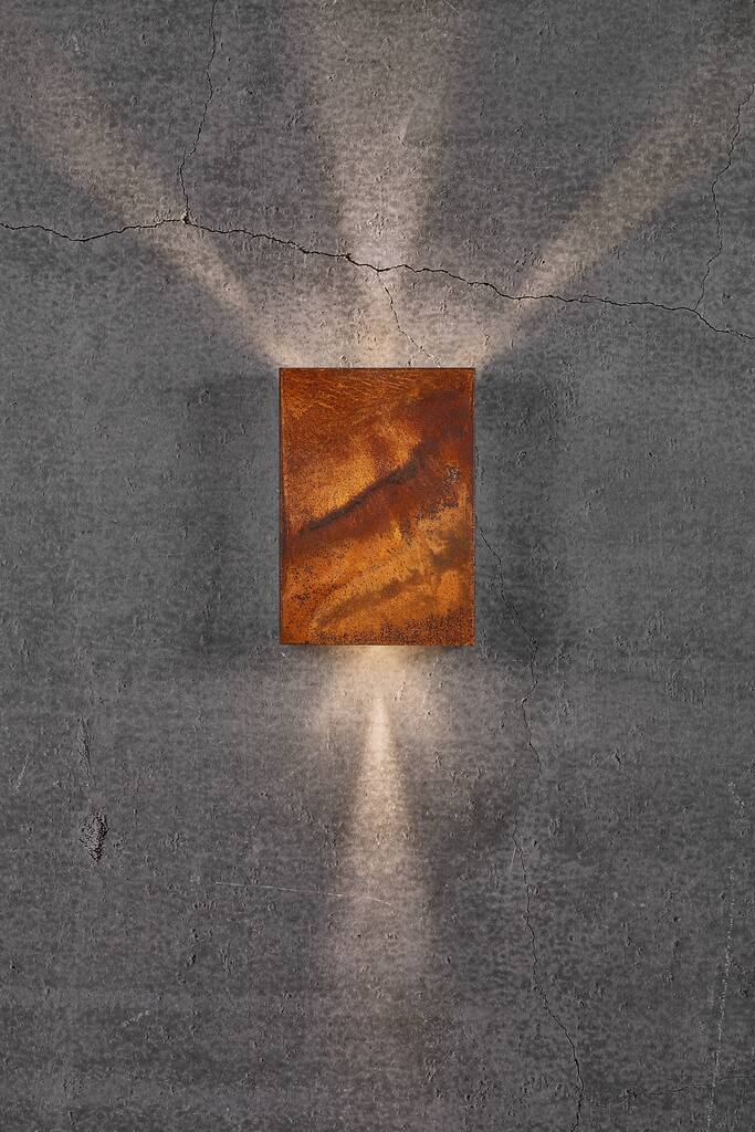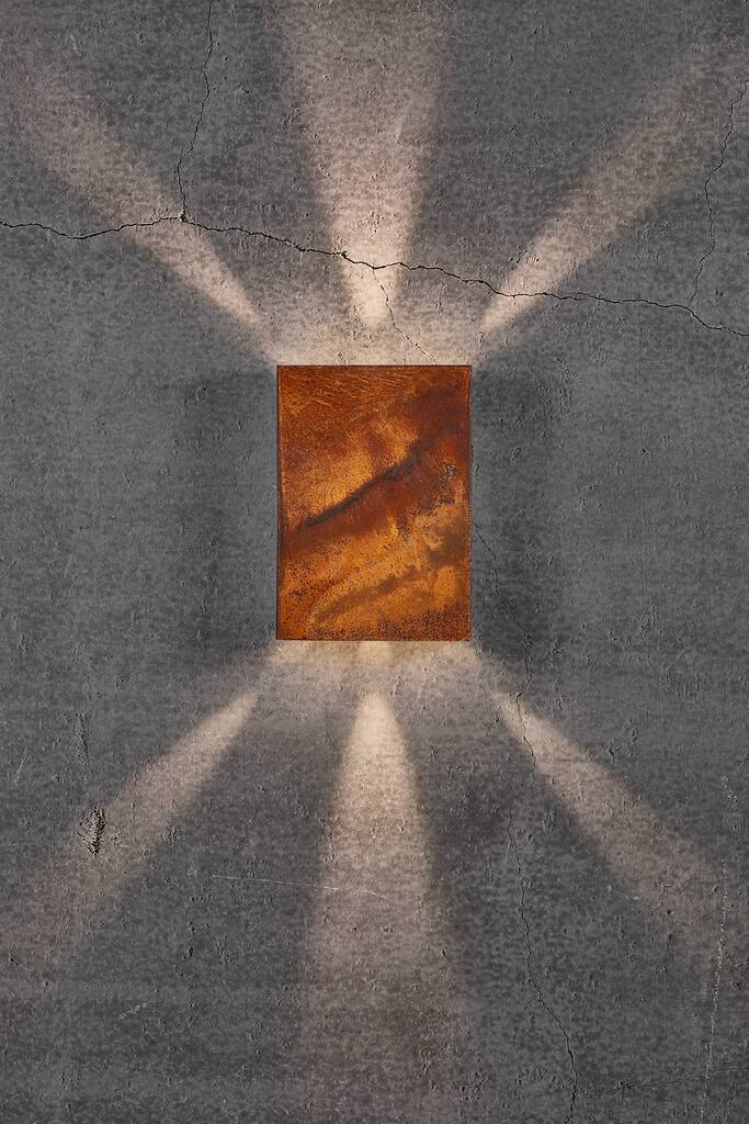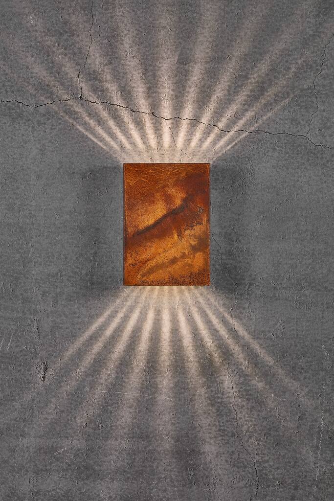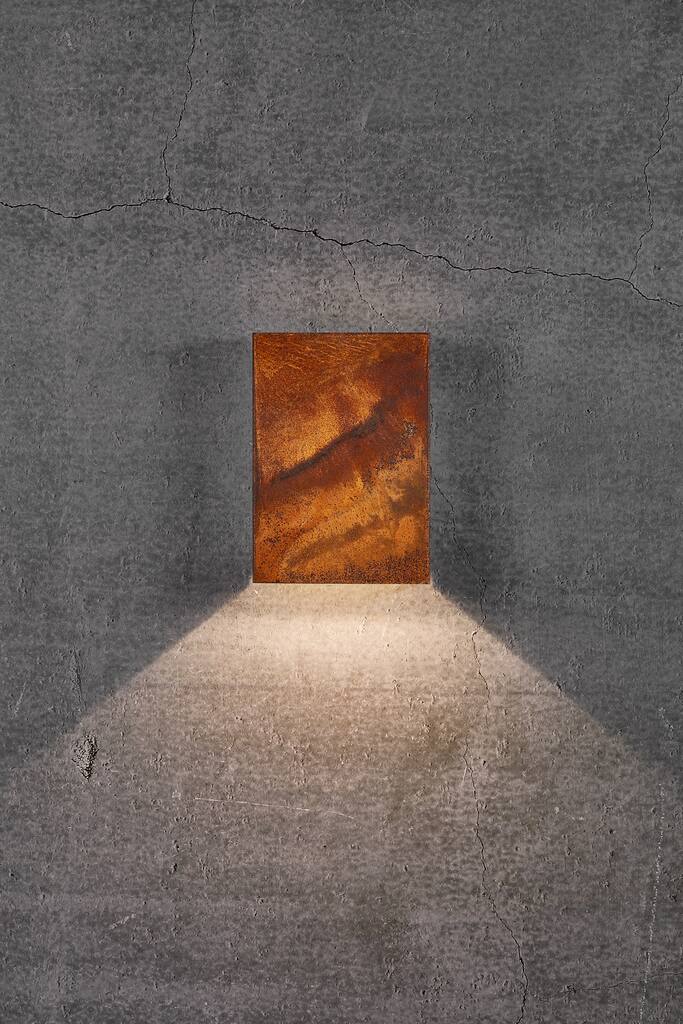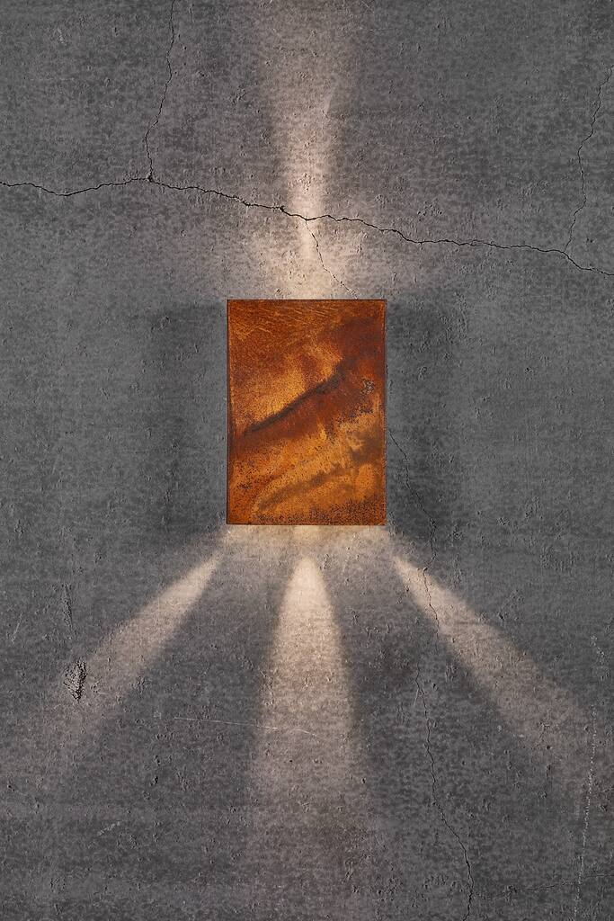 Дизайн одновременно декоративный и скульптурный, что делает настенный светильник Fold из кортена подходящим как для помещений, так и для улицы.