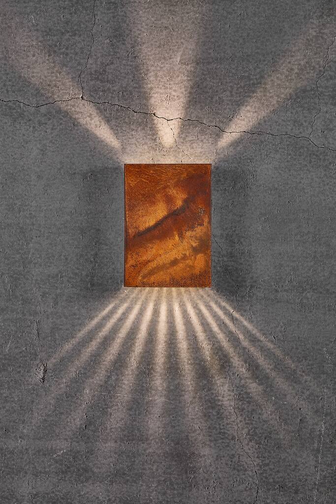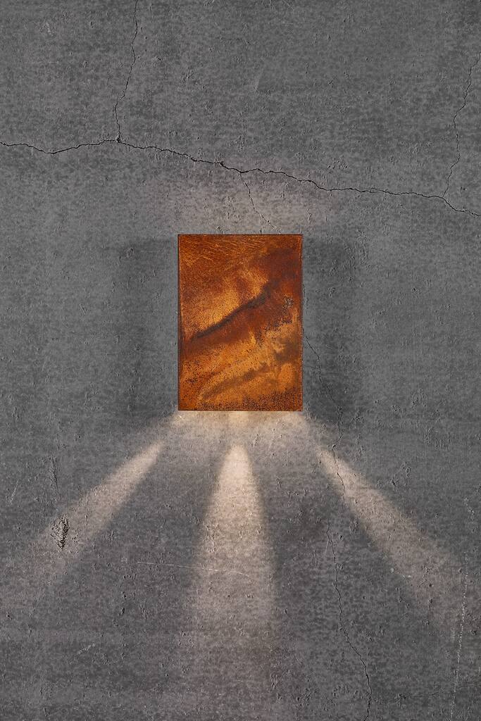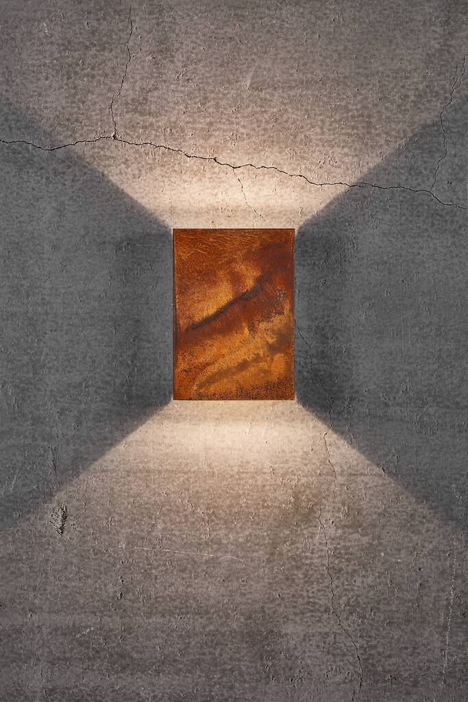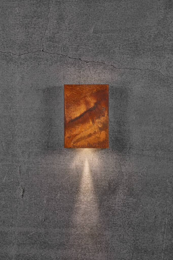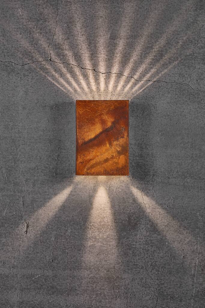 Дизайн одновременно декоративный и скульптурный, что делает настенный светильник Fold из кортена подходящим как для помещений, так и для улицы.