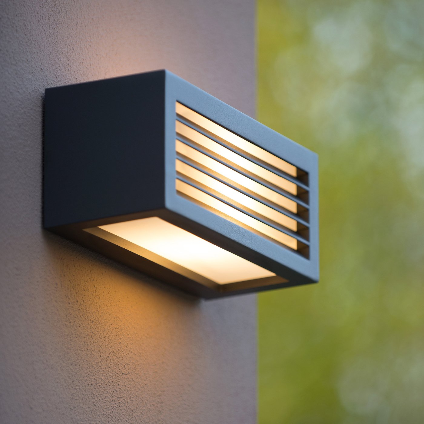 Настенный уличный светильник предназначен для фасадного освещения и установки на наружных стенах, террасах или возле входных зон. Корпус прямоугольной формы выполнен из алюминия и окрашен в серый цвет, передняя часть закрыта плафоном с горизонтальными ламелями, через которые свет распределяется фронтально, дополнительно имеется нижний и верхний световой выход. Используется одна лампа с цоколем E27 мощностью до 18 Вт, лампа не входит в комплект. Питание от сети 230 В, предусмотрена возможность диммирования. Степень защиты IP54 позволяет эксплуатацию на улице. Габариты составляют 25 × 10,8 × 11 см, установка накладная на стену.