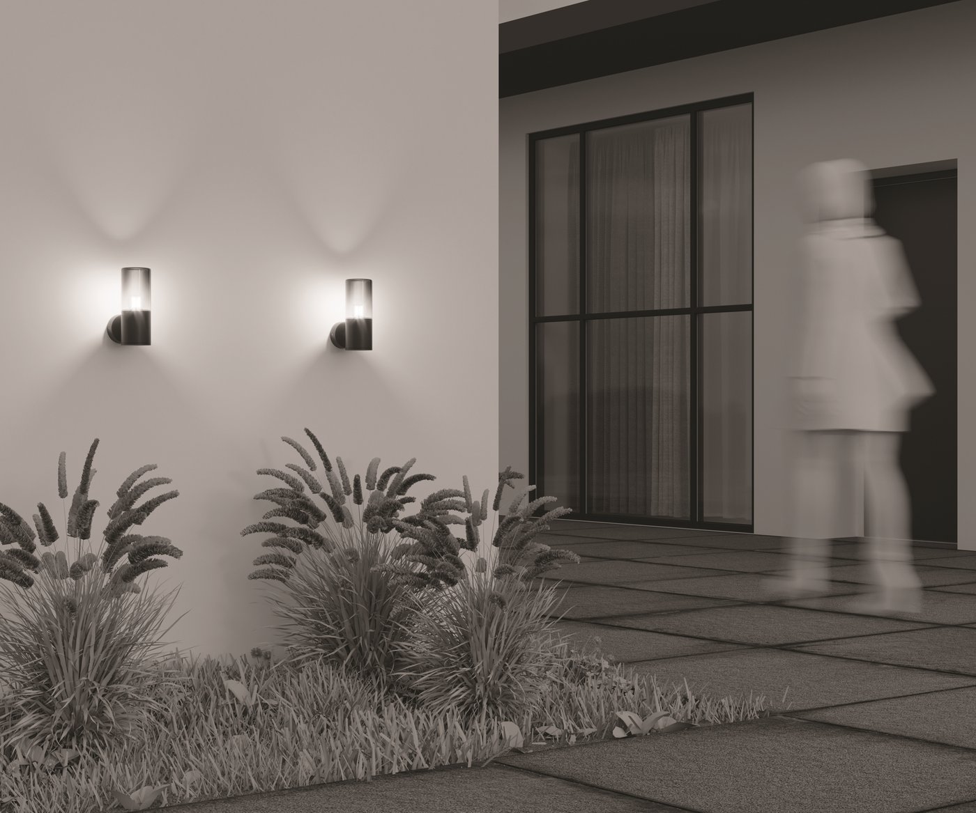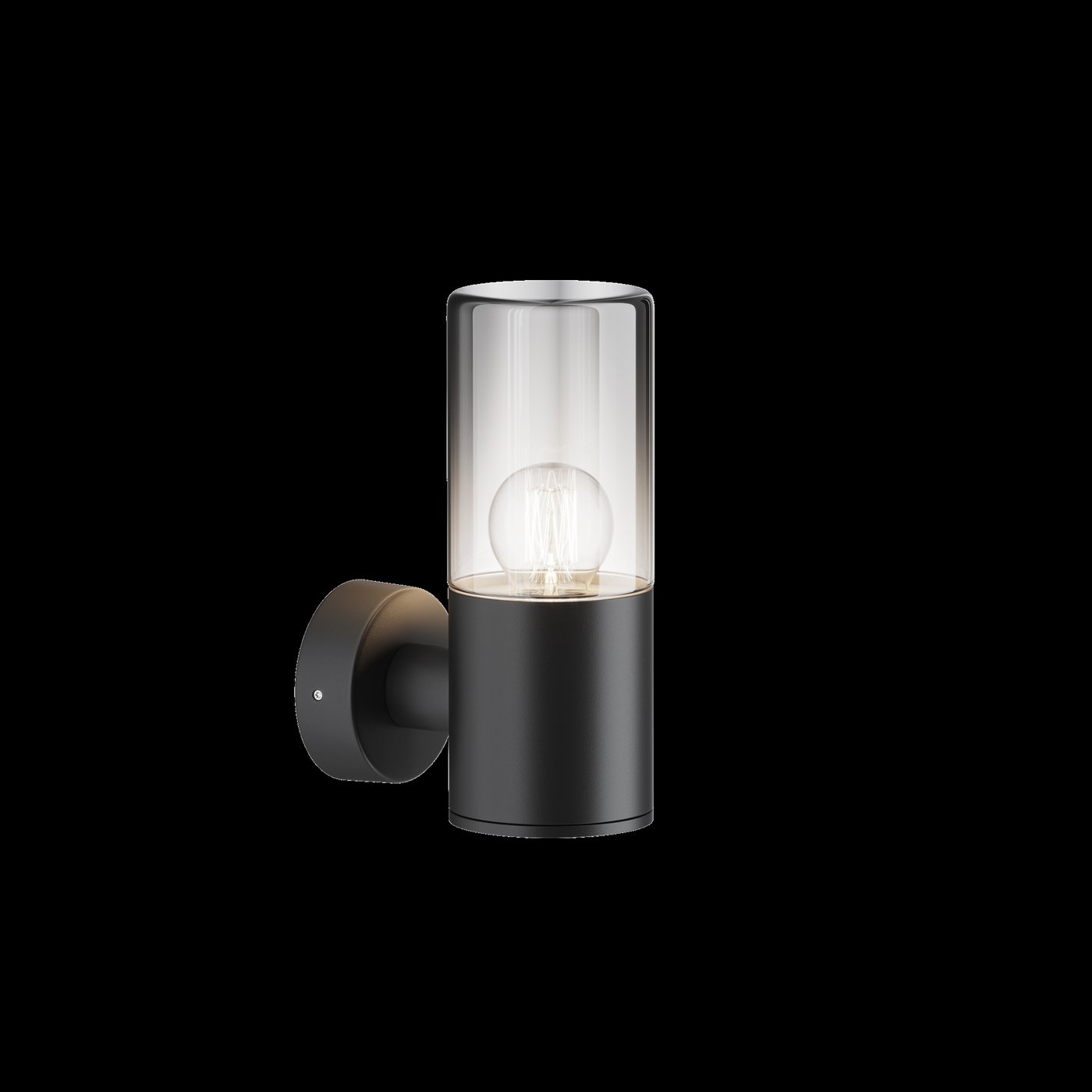 Настенный уличный светильник выполнен в виде компактного цилиндра: алюминиевый корпус в графитовом цвете и прозрачный верхний колпак из тонированного стекла, защищающий лампу от осадков. В коллекции Maytoni Amas источник света расположен внутри стеклянной части, поэтому свет выходит вокруг лампы и даёт мягкое круговое свечение без резкого направленного луча. Такой формат удобен на фасаде, террасе или у входной группы: при подходе к двери свет равномерно подсвечивает участок стены и зону перед собой, а при движении вдоль дорожки не слепит в глаза. Патрон E27 позволяет подобрать лампу по яркости и температуре, включая варианты с тёплым светом для вечернего сценария или более нейтральным для функциональной подсветки. Степень защиты IP54 рассчитана на дождь и пыль, поэтому светильник подходит для открытых площадок. Максимальная мощность до 60 Вт даёт запас по световому потоку, если нужно сделать наружное освещение заметным и читаемым издалека.