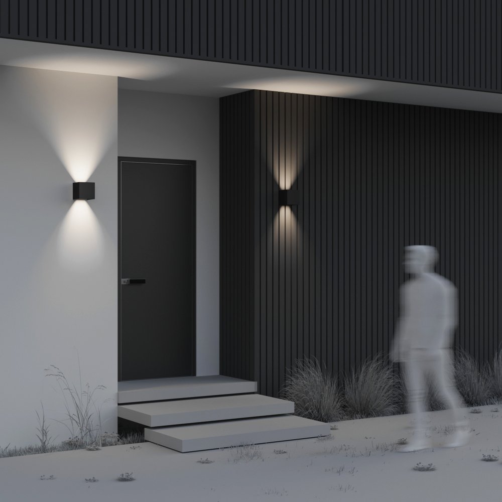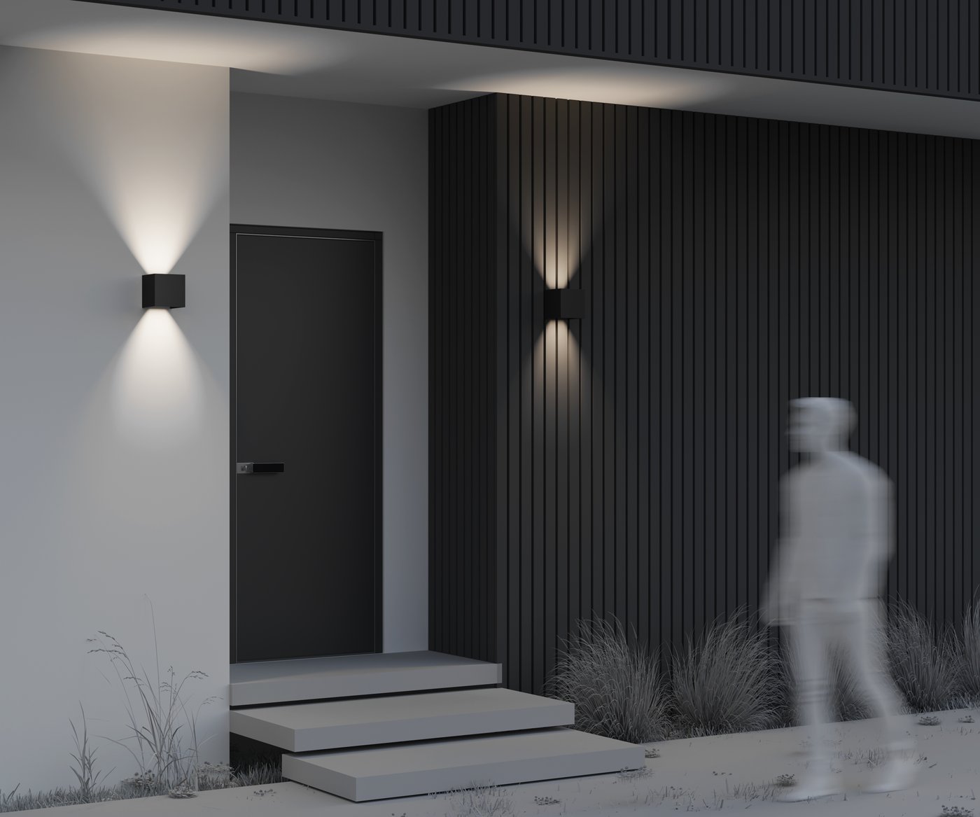 Настенный уличный светильник выполнен в компактном прямоугольном корпусе, который закрывает источник и формирует два направленных пучка вверх и вниз. В коллекции Maytoni Fulton конструкция рассчитана именно на архитектурную подсветку: свет выходит через регулируемые шторки, поэтому можно менять ширину и угол луча и собирать световую графику на фасаде. В реальном сценарии это видно, когда человек подходит к дому вечером — на стене появляются чёткие световые «веера», которые подчёркивают фактуру штукатурки или ритм колонн, при этом сам источник не слепит. Световой поток 1050 лм при мощности 20 Вт даёт яркость, достаточную для акцентирования входной группы или пролёта между окнами, особенно при установке на высоте 2–3 метров. Тёплая температура 3000 К делает фасад визуально более объёмным и снижает холодные оттенки в отделке. Угол 67° помогает удерживать свет в заданной зоне без лишней засветки, а степень защиты IP54 и алюминиевый корпус с порошковым покрытием рассчитаны на работу на улице.