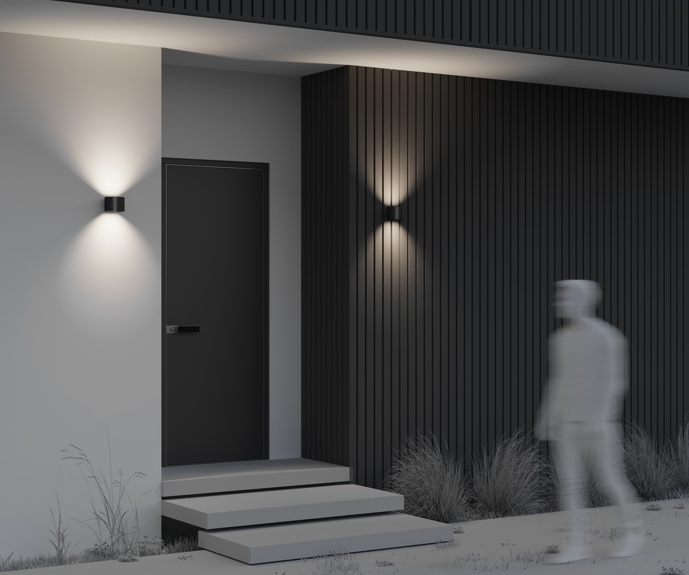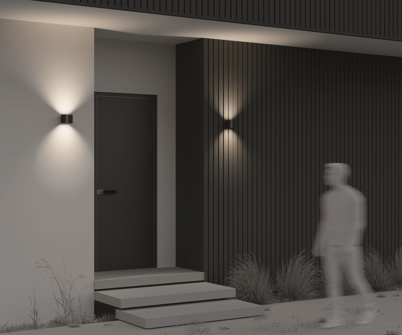 Настенный уличный светильник выполнен как компактный цилиндрический корпус с двусторонним выходом света, формирующий симметричные пучки вверх и вниз по фасаду. В коллекции Maytoni Fulton внутри предусмотрены подвижные шторки, которые позволяют вручную настроить форму луча и собрать световую графику — от широкого веера до более узкого направленного пятна. В реальном сценарии при установке рядом с входной дверью или на колонне можно «подрезать» свет так, чтобы он не попадал в окна и не слепил при выходе на улицу, а подчёркивал фактуру стены. Угол рассеивания 90° даёт заметный световой рисунок на вертикальной поверхности, при этом поток остаётся достаточно контролируемым. Световой поток 400 лм при мощности 6 Вт рассчитан на декоративную архитектурную подсветку, а температура 3000 К даёт тёплый оттенок, который хорошо работает на камне, штукатурке и дереве. Степень защиты IP54 обеспечивает устойчивость к пыли и брызгам, алюминиевый корпус и порошковая окраска рассчитаны на уличные условия. Индекс цветопередачи Ra 80 подходит для фасадного освещения.