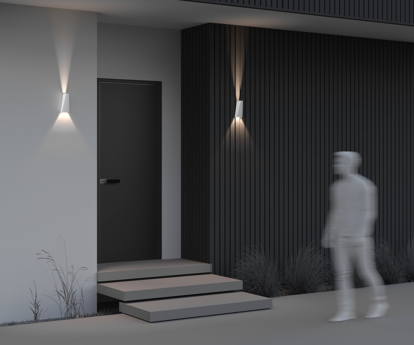 Настенный светильник с геометричным корпусом предназначен для создания световой графики на фасаде или в интерьере. В коллекции Times Square от Maytoni модель выполнена в белом металлическом корпусе и формирует направленный поток вниз, подчёркивая фактуру стены. При включении световой пучок раскрывается под углом 120°, образуя мягкое треугольное пятно и создавая акцентный свет вдоль входной группы или коридора. Световой поток 100 лм при мощности 6 Вт рассчитан не на яркое освещение, а на декоративную архитектурную подсветку с аккуратным контуром. Цветовая температура 3200K даёт тёплый оттенок, который комфортно воспринимается в вечернее время. Степень защиты IP54 позволяет устанавливать модель на улице, защищая её от пыли и брызг воды, а встроенный LED-модуль не требует замены источника света.