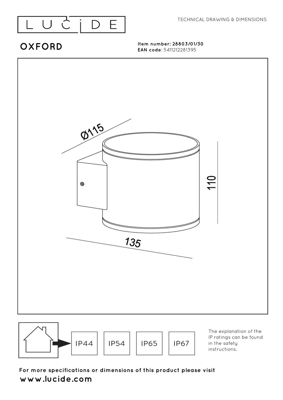 28803/01/30 Lucide Oxford уличный настенный светильник с цилиндрическим корпусом чёрного цвета