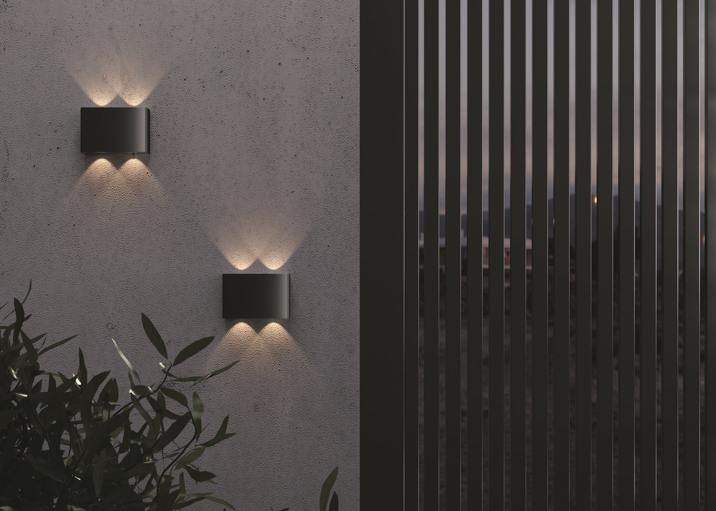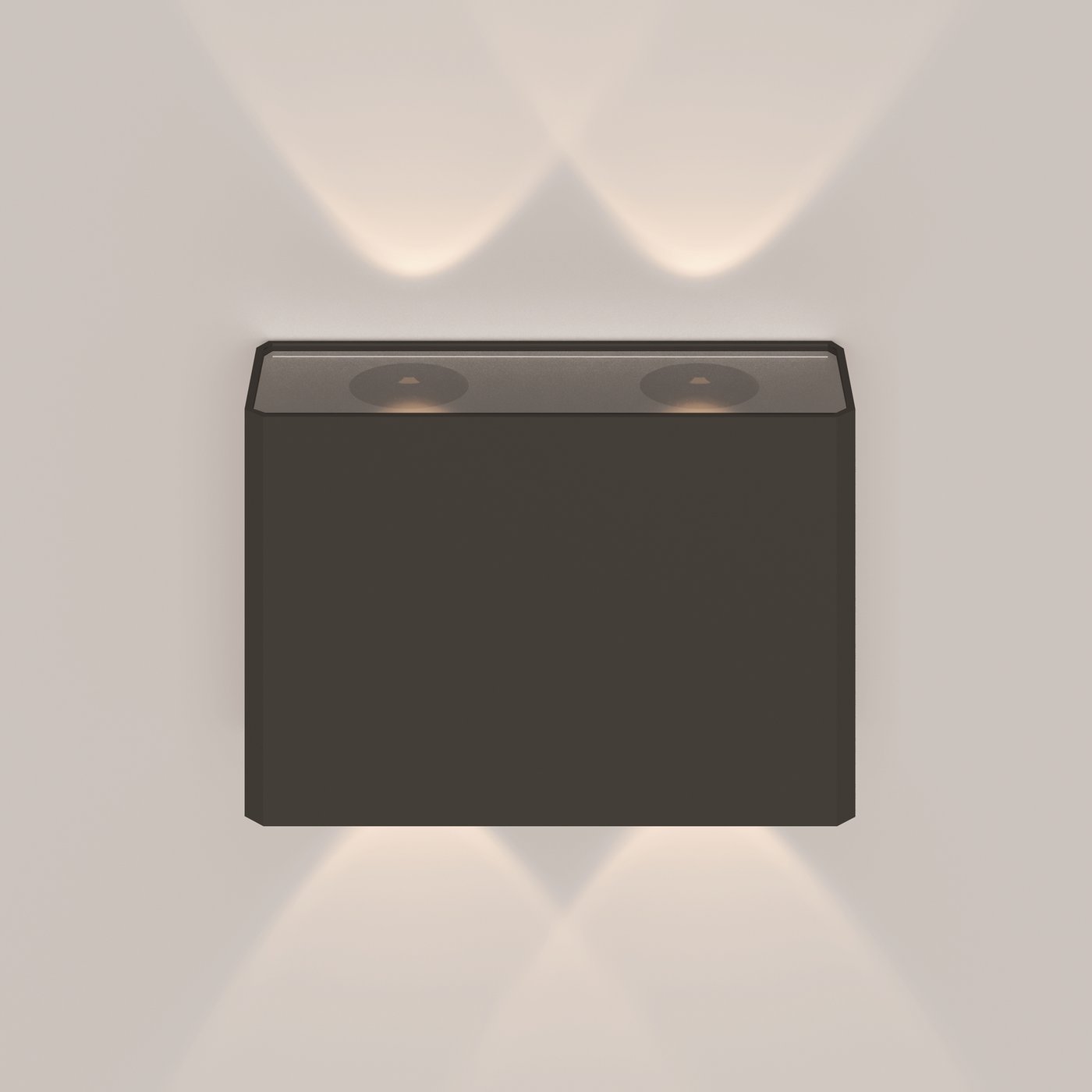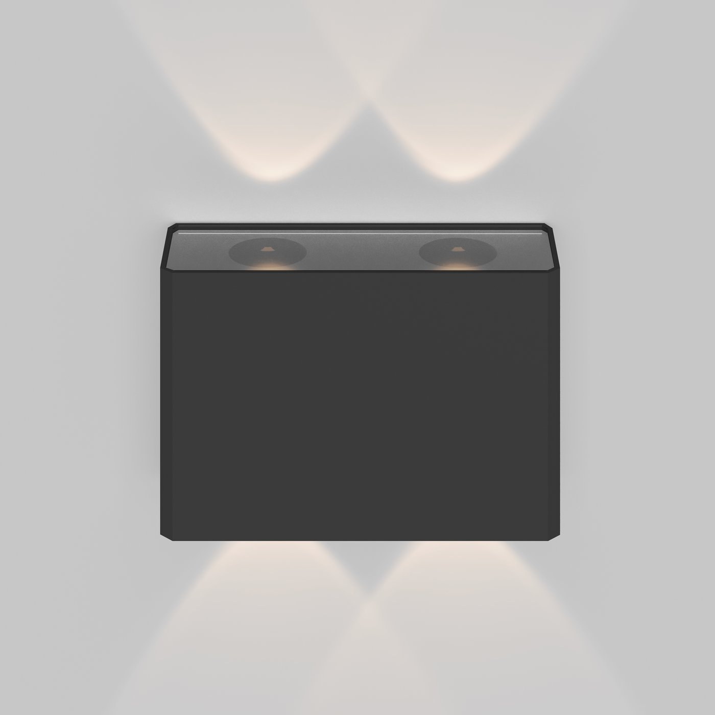Этот настенный светильник сделан как строгий архитектурный блок, который работает не на яркость, а на световой рисунок. Прямоугольный корпус выглядит собранно и даёт два направленных луча, формируя на стене характерные «крылья» вверх и вниз. Его ставят на фасаде у входа, на террасе или вдоль глухой стены, чтобы вечером включить подсветку и сразу обозначить вертикаль здания без лишней засветки вокруг. Поток 200 лм рассчитан на акцент и ориентацию, а не на замену основного уличного света. Тёплая температура 3000 К делает поверхность стены мягче и лучше подчёркивает фактуру штукатурки или камня. Угол 64° даёт читаемую форму луча, а защита IP54 позволяет использовать светильник под дождём и ветром в обычных уличных условиях.