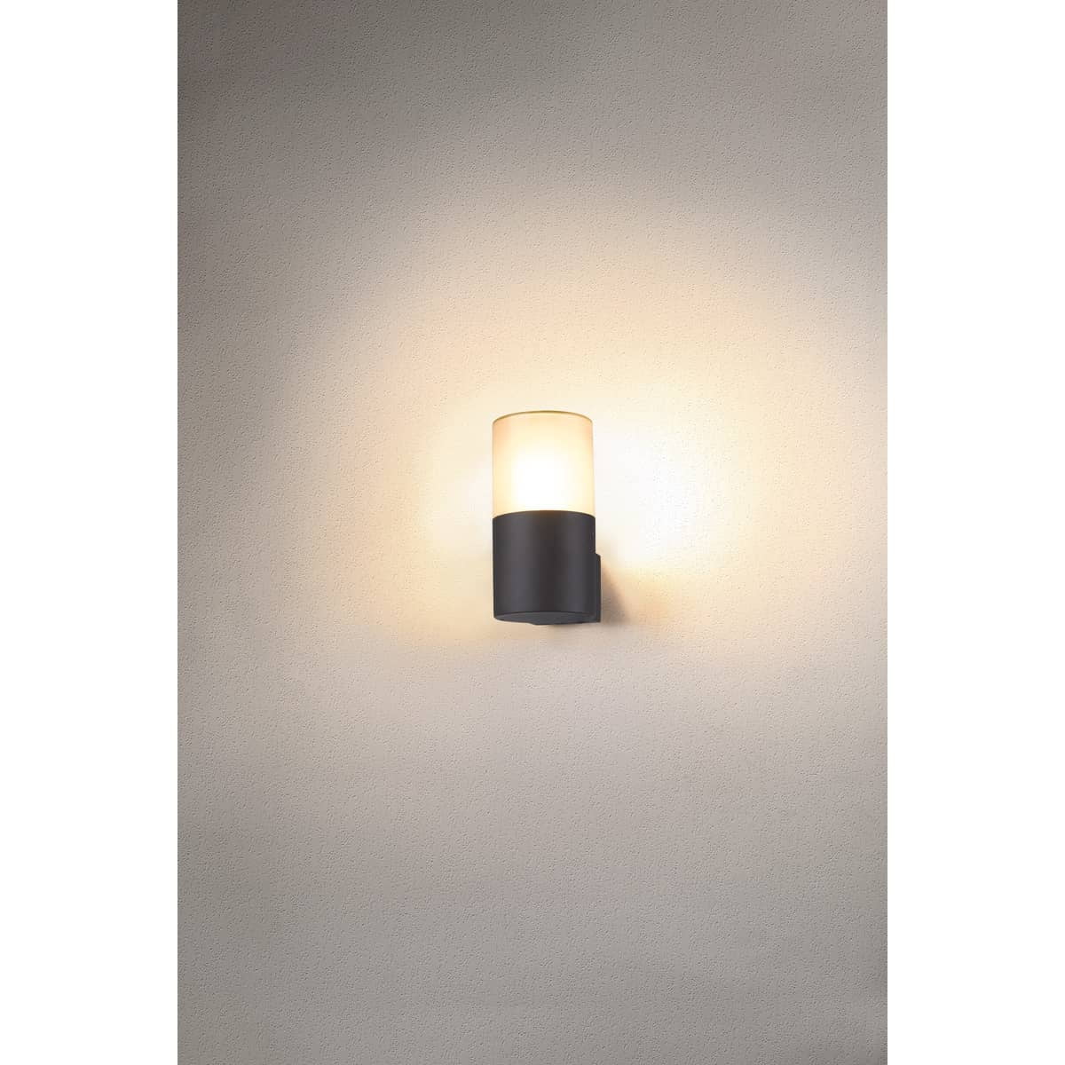 Настенный уличный светильник предназначен для фасадного освещения и крепится на вертикальную поверхность через заднее основание. Конструкция включает цилиндрический корпус из алюминия в антрацитовом цвете и верхний светорассеиватель из сатинированного акрила с эффектом дымчатого стекла, который визуально меняется при включении. Свет распространяется через верхнюю часть плафона, формируя мягкое рассеянное освещение вокруг точки установки. Внутри предусмотрен патрон под лампу с цоколем E27 мощностью до 11 Вт, что позволяет использовать различные типы источников света. Степень защиты IP44 обеспечивает возможность эксплуатации на улице при воздействии влаги.