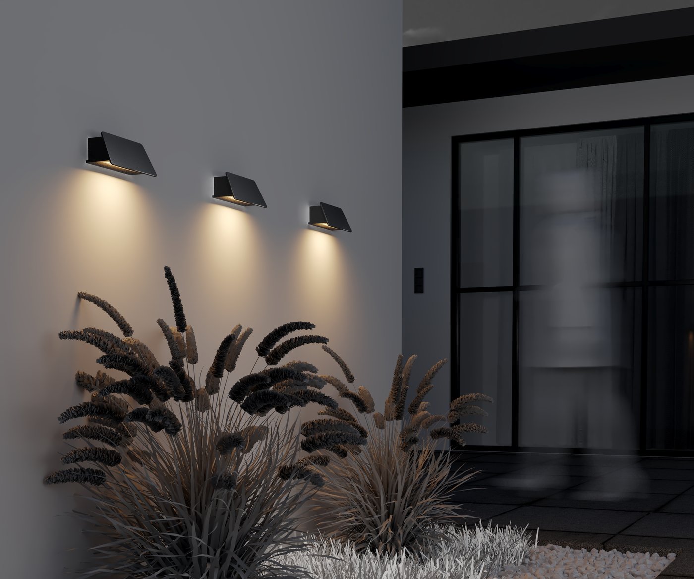 Уличное настенное бра с наклонной алюминиевой крышкой скрывает источник света и формирует направленный поток вниз без видимой точки свечения. В серии Maytoni Trupp корпус в графитовом цвете экранирует светодиод, создавая эффект «невидимого света» и защищая глаза от прямого ослепления. Светильник работает как локальное освещение входной зоны или прохода: при включении поток с углом 90° мягко подсвечивает стену и дорожку под ней, помогая ориентироваться в темноте, когда человек подходит к двери. Мощность 6 Вт и световой поток 300 лм рассчитаны на акцентную подсветку, а температура 3000 К даёт тёплый свет, комфортный для фасадов жилых домов. Алюминиевый корпус устойчив к внешним воздействиям, а степень защиты IP54 позволяет эксплуатировать модель под открытым небом при осадках и пыли. Индекс цветопередачи Ra 80 сохраняет естественность оттенков отделки и растений в зоне подсветки.