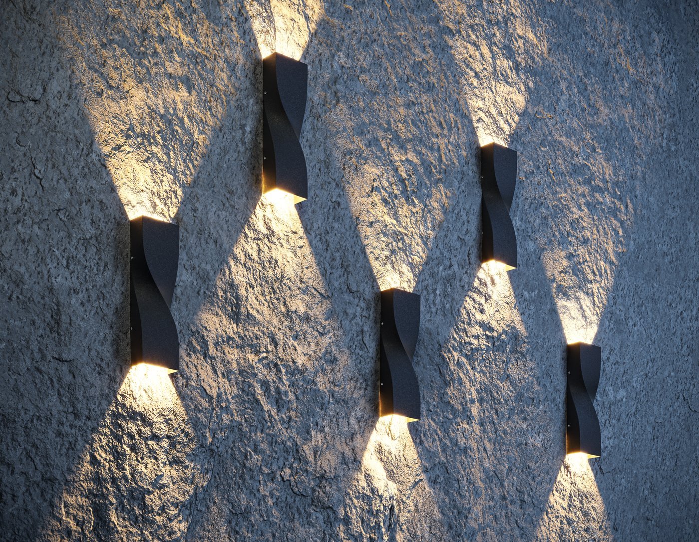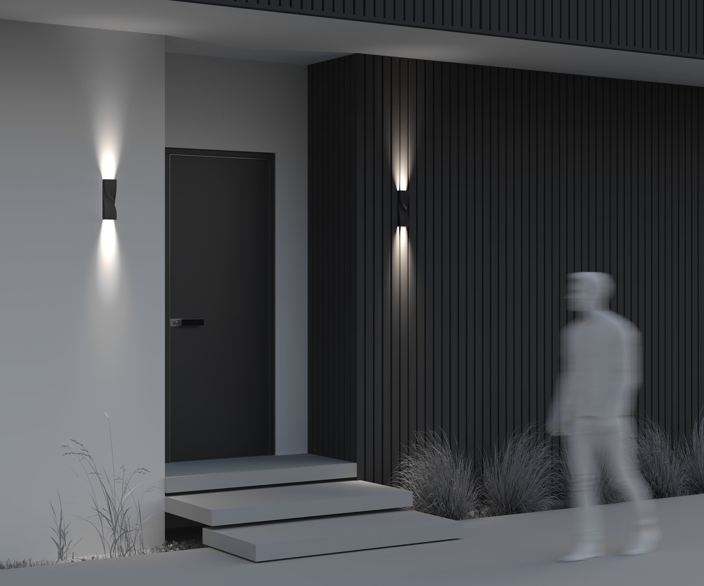Архитектурная подсветка Twist воспринимается как акцентный объект с выразительной скрученной формой, где корпус работает не фоном, а частью фасадной пластики. Чёткий вертикальный силуэт с матовой поверхностью фиксирует внимание даже днём, а в тёмное время суток начинает работать через свет, выходящий вверх и вниз. Такой светильник включают вечером на стене террасы или у входной группы, когда нужно обозначить плоскость и задать ритм фасаду, не заливая пространство общим светом. Направление потока можно сузить с одной или двух сторон, формируя аккуратные световые лучи и управляя графикой на стене. Встроенный LED-модуль мощностью 11 Вт даёт поток 700 лм с тёплой температурой 3000 К, достаточный для выразительного, но не агрессивного свечения. Защита IP65 позволяет использовать модель как постоянный архитектурный акцент, рассчитанный на работу в уличной среде без изменения сценария.