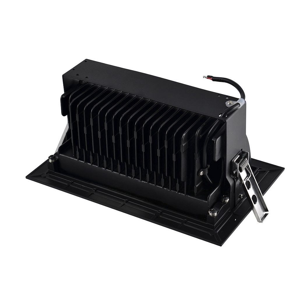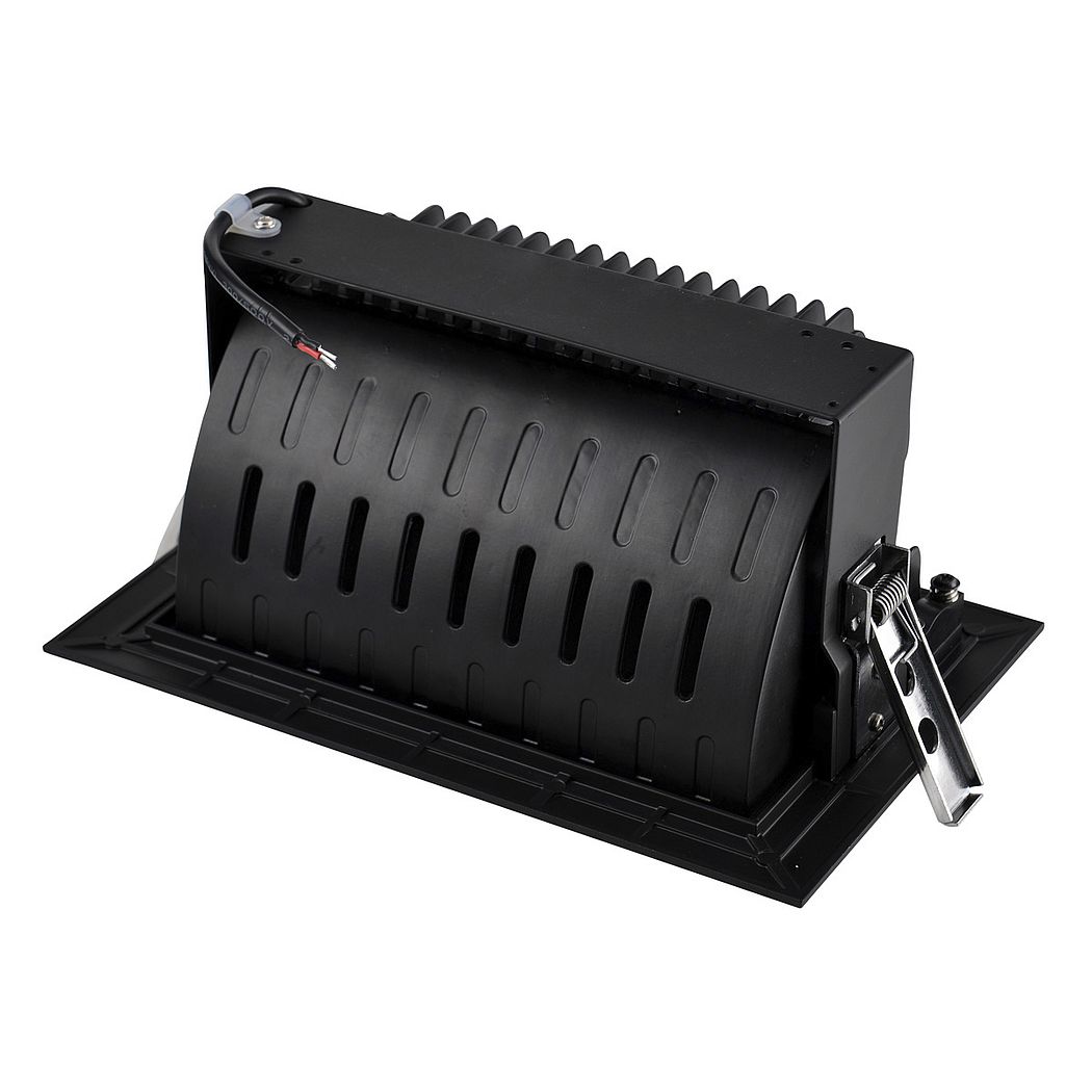 Встраиваемый потолочный светильник прямоугольной формы с утопленным световым модулем, предназначенный для направленного освещения в коммерческих пространствах. Корпус выполнен в чёрном цвете, внутри расположен светодиодный блок с телескопической конструкцией, позволяющей изменять положение источника и направлять световой поток. Используется встроенный LED-модуль мощностью около 35–36 Вт с цветовой температурой 3000K, что задаёт тёплый оттенок света. Для работы требуется внешний драйвер постоянного тока, так как преобразователь не встроен. Глубокая посадка источника и форма отражателя помогают контролировать светораспределение и уменьшать прямую засветку.