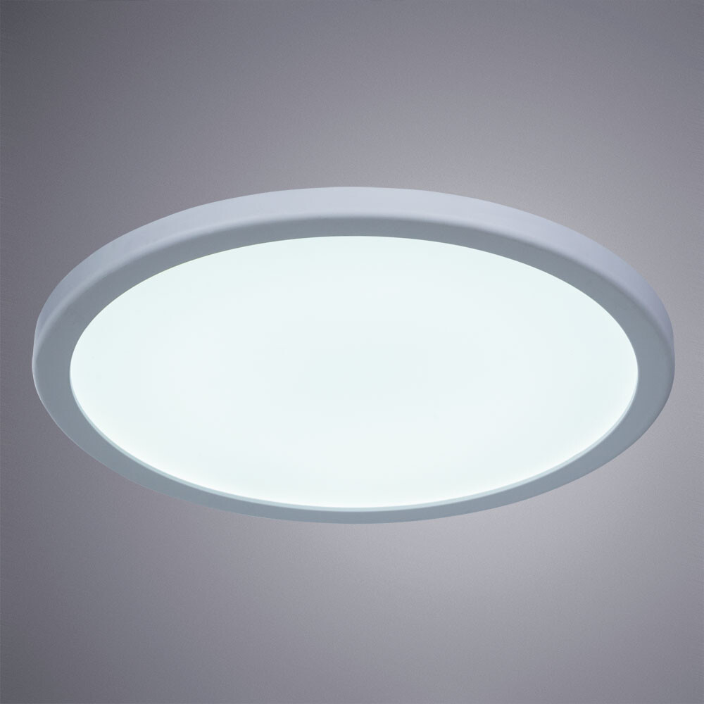 Встраиваемый потолочный светильник Arte Lamp Mesura A7974PL-1WH выполнен в современном стиле техно и отличается лаконичной круглой формой с плоским матовым рассеивателем белого цвета. Конструкция сочетает металлическую арматуру и акриловый плафон, формируя ровное мягкое свечение без резких перепадов. Модель оснащена встроенным светодиодным источником мощностью 14 Вт со световым потоком 1000 лм и нейтральной цветовой температурой 4000 К. Свет направлен вниз, что делает светильник подходящим для общего освещения жилых помещений, включая гостиную, кабинет и коридор. Диаметр корпуса составляет 175 мм при высоте 20 мм, монтаж выполняется на прижимных скобах, размер врезного отверстия — 50–160 мм. Светильник рассчитан на питание 220 В, имеет степень защиты IP20, класс энергопотребления A и ресурс светодиода до 20 000 часов, при этом возможность диммирования не предусмотрена.