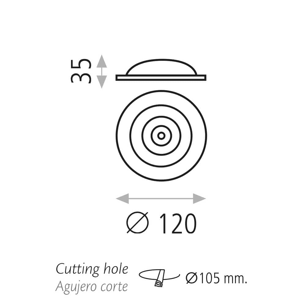 Встраиваемый светильник круглой формы предназначен для монтажа в потолочные или мебельные конструкции и обеспечивает направленное освещение помещений. Корпус выполнен из текстурированного белого материала с акриловым диффузором, рассеивающим свет встроенных светодиодов. Конструкция включает один светодиод мощностью 7 Вт и один светодиод мощностью 3 Вт с цветовой температурой 3000 K, суммарный световой поток составляет 856 лм. Диаметр лицевой панели 120 мм, высота 35 мм, для монтажа требуется вырез диаметром 105 мм. На изображениях показано, что светильник устанавливается заподлицо с поверхностью, а ступенчатая форма диффузора формирует направленный и равномерный свет. Производитель — ACB Iluminacion, коллекция Bios, артикул P328810BCD.
