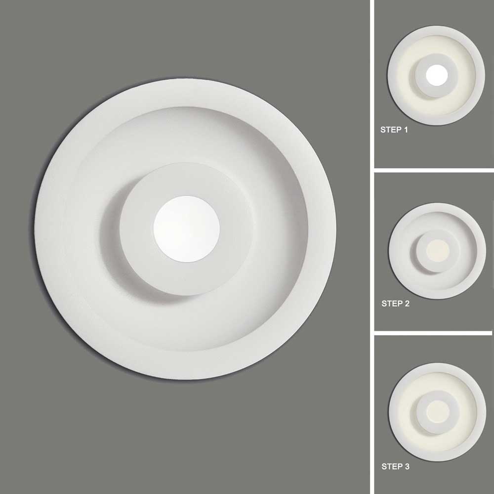 Встраиваемый светильник круглой формы предназначен для установки в потолок или мебельные панели с целью равномерного освещения интерьера. Корпус выполнен из текстурированного белого материала с акриловым диффузором, рассеивающим свет от встроенных светодиодов. В конструкции используется один светодиод мощностью 7 Вт и один светодиод мощностью 3 Вт с цветовой температурой 4000 K, суммарный световой поток составляет 856 лм. Диаметр лицевой панели 120 мм, высота 35 мм, для монтажа требуется вырез диаметром 105 мм. На изображениях видно, что светильник устанавливается заподлицо, а ступенчатая форма диффузора формирует мягкий направленный свет. Производитель — ACB Iluminacion, коллекция Bios, артикул P32881BCD.