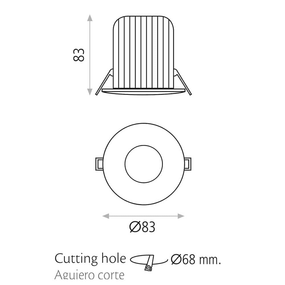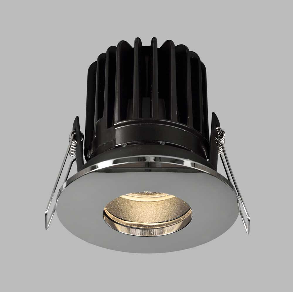 Встраиваемый потолочный светильник предназначен для установки в потолок с направленным освещением. Корпус оснащён лицевой рамкой из хромированного металла, диаметр 83 мм, высота 83 мм, монтаж выполняется с помощью пружинных зажимов. Источник света — встроенный светодиод COB мощностью 10 Вт, световой поток 750 лм, цветовая температура 3000 K, степень защиты IP64 обеспечивает защиту от пыли и влаги, что позволяет использовать светильник в помещениях с повышенной влажностью. Для монтажа требуется отверстие диаметром 68 мм, конструкция обеспечивает скрытую интеграцию и концентрированное освещение зоны под светильником.