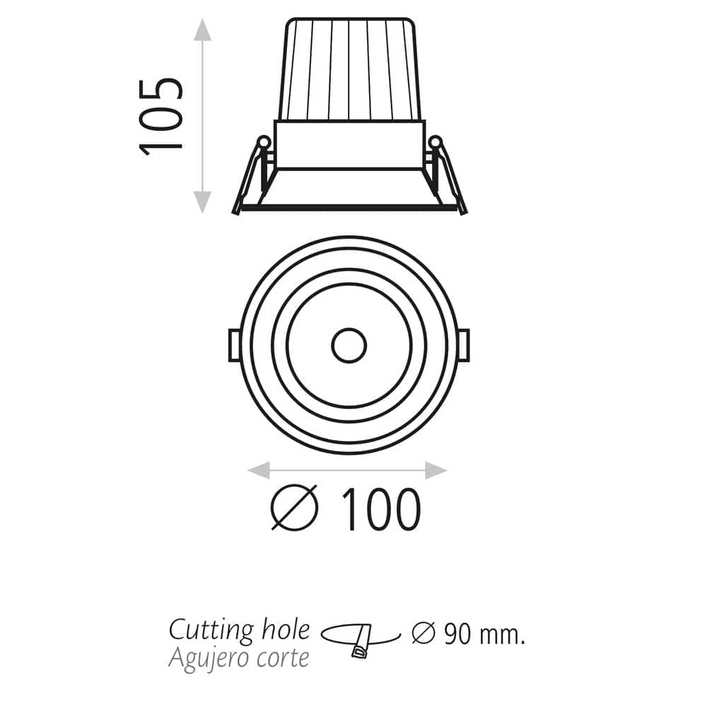 Светильник представляет собой встраиваемый точечный потолочный прибор с круглым белым корпусом и LED-источником света, предназначенный для освещения ванной комнаты. Конструкция включает в себя плафон с углублением и держатели для фиксации в монтажном отверстии диаметром 90 мм, общий диаметр светильника 100 мм, высота 105 мм. На фото видна компактная форма и белое покрытие корпуса, обеспечивающее нейтральный вид в интерьере. Модель предлагается в двух размерах, обеспечивает направленное освещение и монтируется заподлицо с потолком, что важно для планирования расположения светильников и визуальной интеграции в потолочную поверхность.