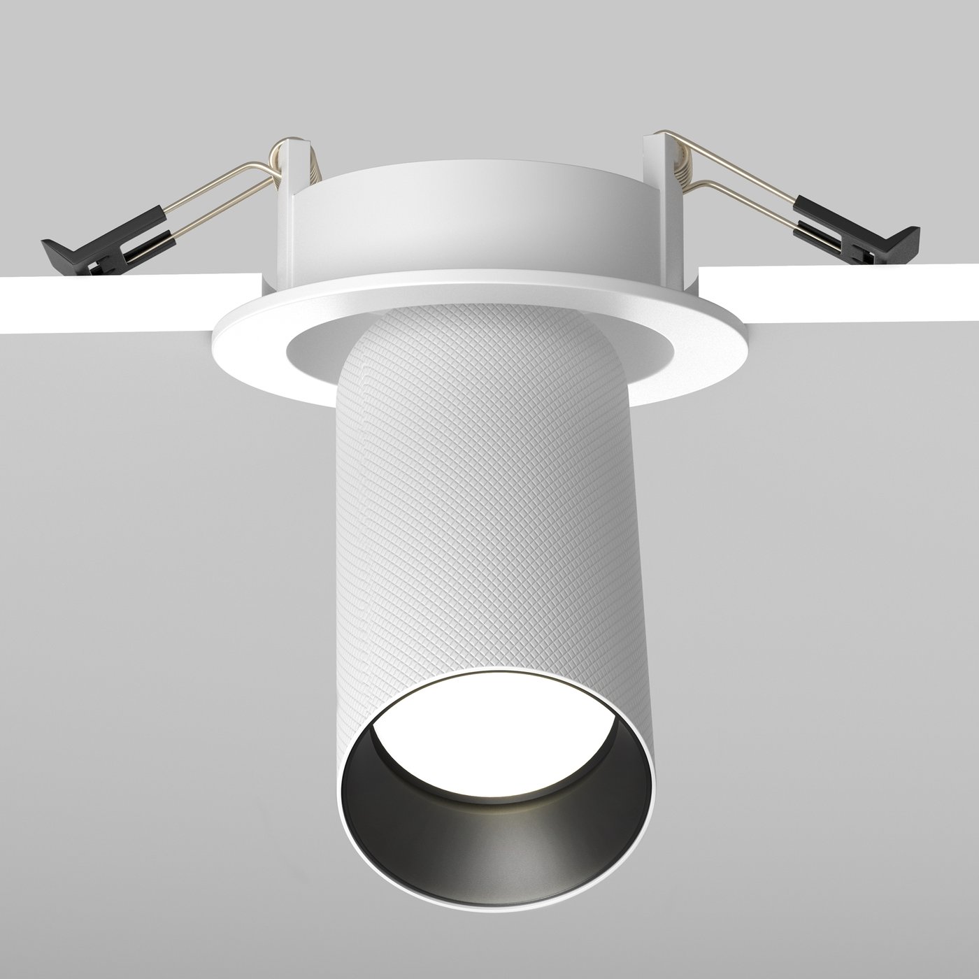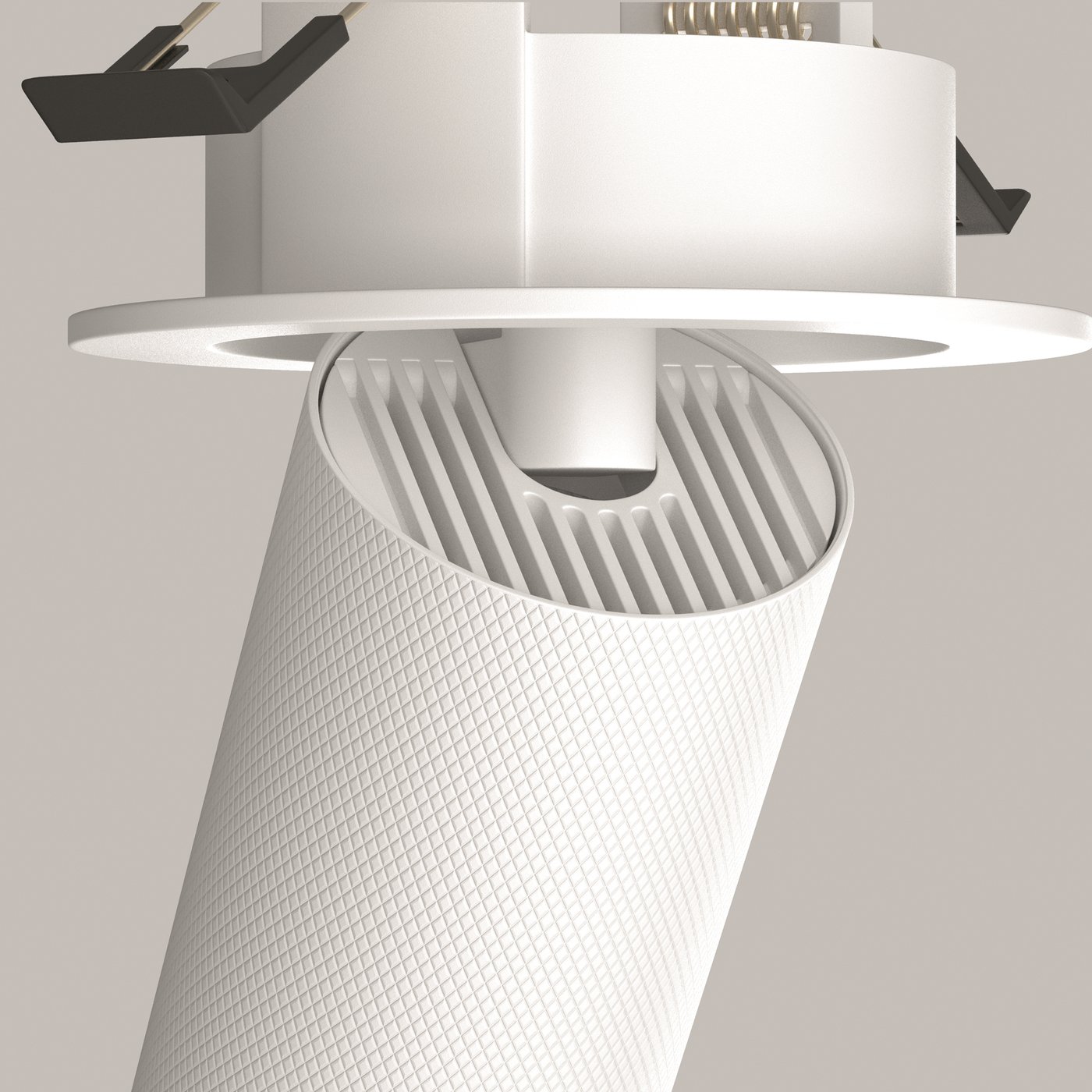Встраиваемый поворотный светильник с цилиндрическим модулем предназначен для точечной подсветки и гибкой работы с направлением луча. В серии Maytoni Artisan корпус из алюминия утапливается в потолок, а выступающий цилиндр можно поворачивать на 350° вокруг оси и наклонять до 90°, направляя свет на стену, картину или рабочую поверхность. Цоколь GU10 позволяет выбирать источник до 10 Вт с нужной температурой и углом рассеивания, формируя как акцентный свет, так и более мягкую локальную подсветку. Утопленная лампа и внутреннее кольцо скрывают её кромку, снижая слепящий эффект при взгляде снизу или под углом. Монтажное отверстие 75 мм и глубина 50 мм подходят для стандартных подвесных потолков, а степень защиты IP20 рассчитана на сухие помещения. Такой формат удобен, когда требуется точная настройка света без изменения расположения светильников.