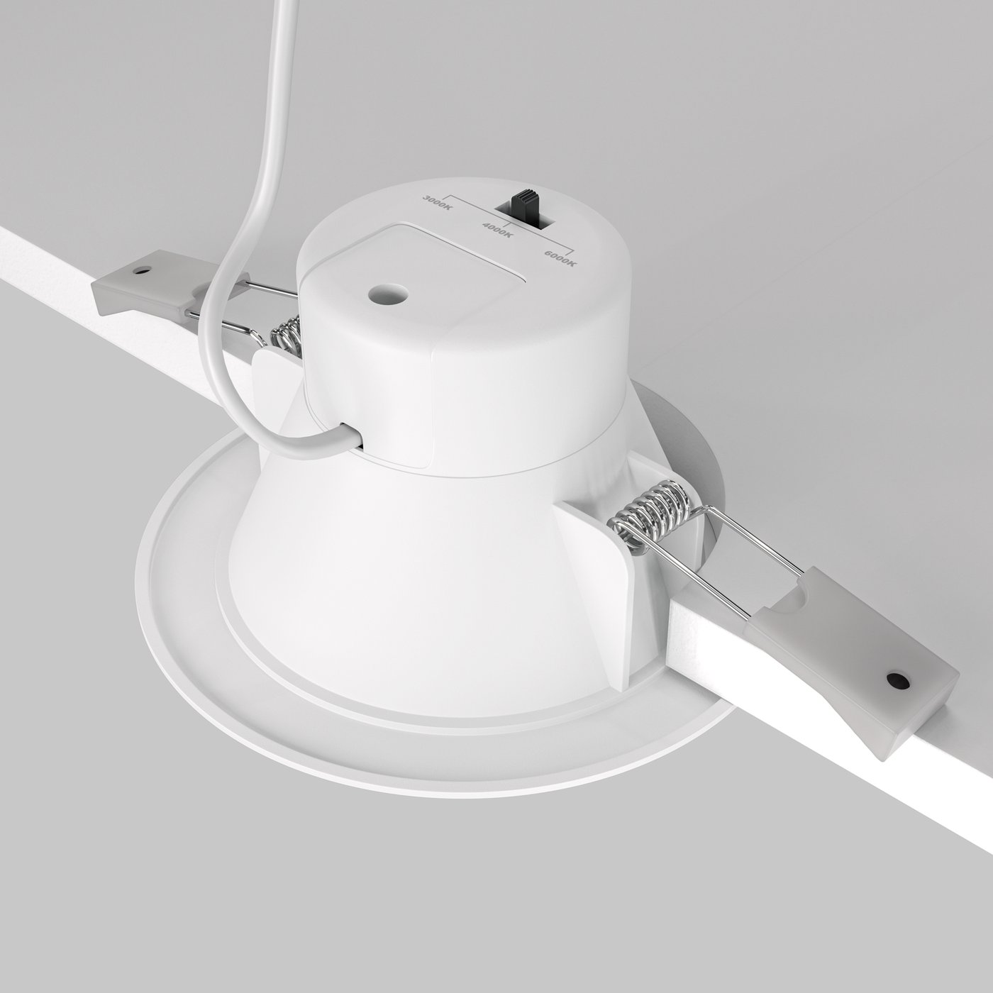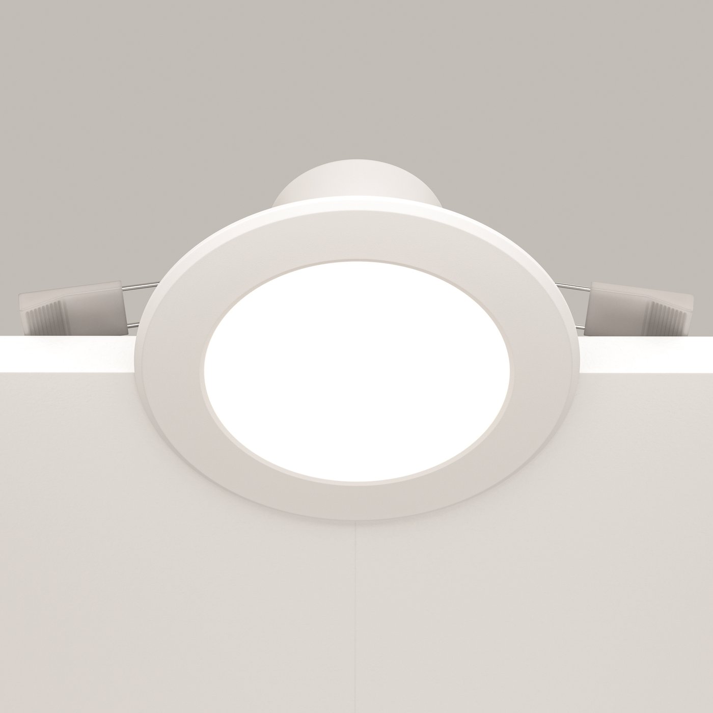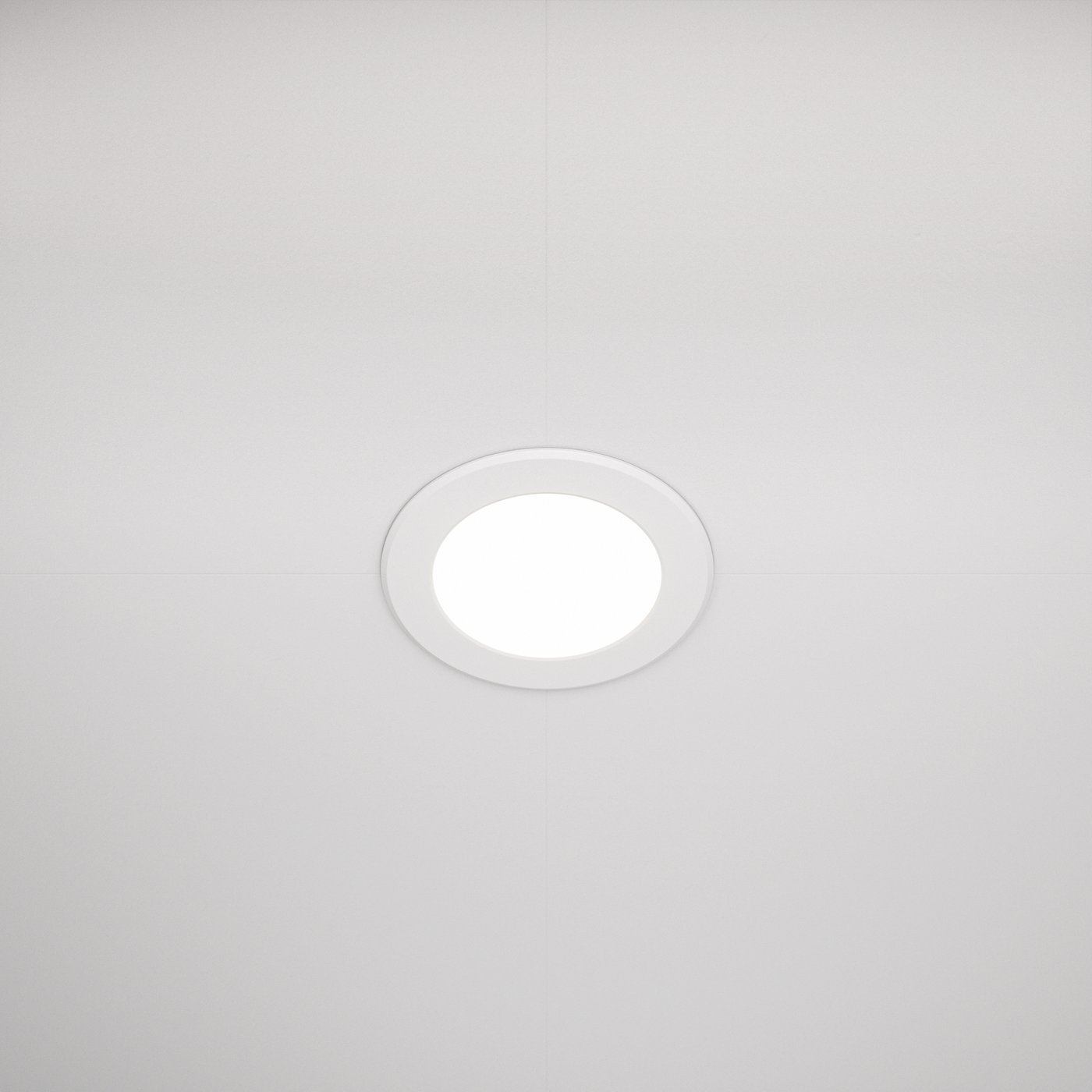 Встраиваемый даунлайт круглой формы предназначен для равномерного общего освещения в помещениях с подвесными или натяжными потолками. В серии Maytoni Stockton светильник выполнен в ультратонком корпусе глубиной 60 мм, что позволяет установить его в ограниченном межпотолочном пространстве без потери жёсткости фиксации. Световой поток 530 лм при мощности 7 Вт распределяется под углом 110°, формируя широкое световое пятно без резкой границы и подходя для основного света в коридоре, кухне или санузле. Переключаемая цветовая температура даёт возможность выбрать тёплый, нейтральный или холодный оттенок прямо при монтаже и согласовать освещение с задачей помещения. Индекс цветопередачи Ra 80 обеспечивает естественное восприятие оттенков в быту. Степень защиты IP44 допускает установку во влажных зонах, а монтажное отверстие диаметром 75 мм упрощает замену стандартных точек.
