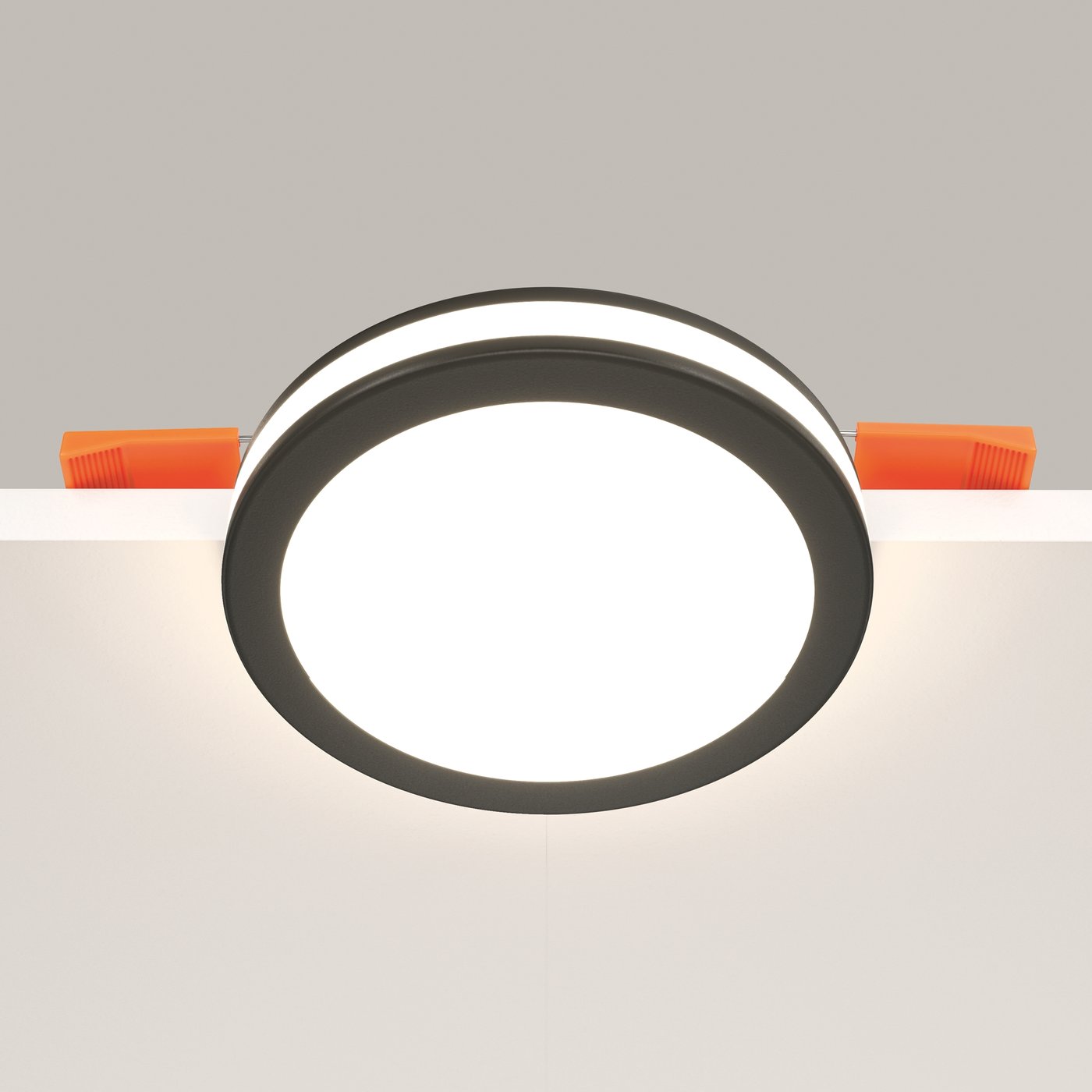 Встраиваемый светильник выполнен как тонкий круглый даунлайт с плоской рамкой и утопленным рассеивателем, поэтому после монтажа он выглядит аккуратным световым кольцом без выступающих деталей. В модели Maytoni из коллекции Phantom свет формируется широким углом 120°, что даёт равномерную заливку и снижает контраст теней на полу и стенах. В реальном сценарии это удобно в коридоре или гардеробной: человек идёт вдоль прохода, и освещённость остаётся стабильной, без резких пятен и «провалов» между точками. Монтажное отверстие 75 мм и глубина установки около 30 мм позволяют ставить светильник в потолки с ограниченным пространством, где не помещаются стандартные встраиваемые модели. Поток 750 лм при мощности 12 Вт подходит для функционального света в небольшой зоне, а тёплая температура 3000 K делает освещение мягче и комфортнее для вечернего режима. Алюминиевый корпус работает как теплоотвод, поддерживая стабильную работу LED-модуля, а класс Class 2 добавляет безопасности за счёт двойной изоляции. Чёрная рамка помогает визуально «собрать» свет в аккуратный круг и делает светильник менее заметным на тёмных потолках или в графичных интерьерах.