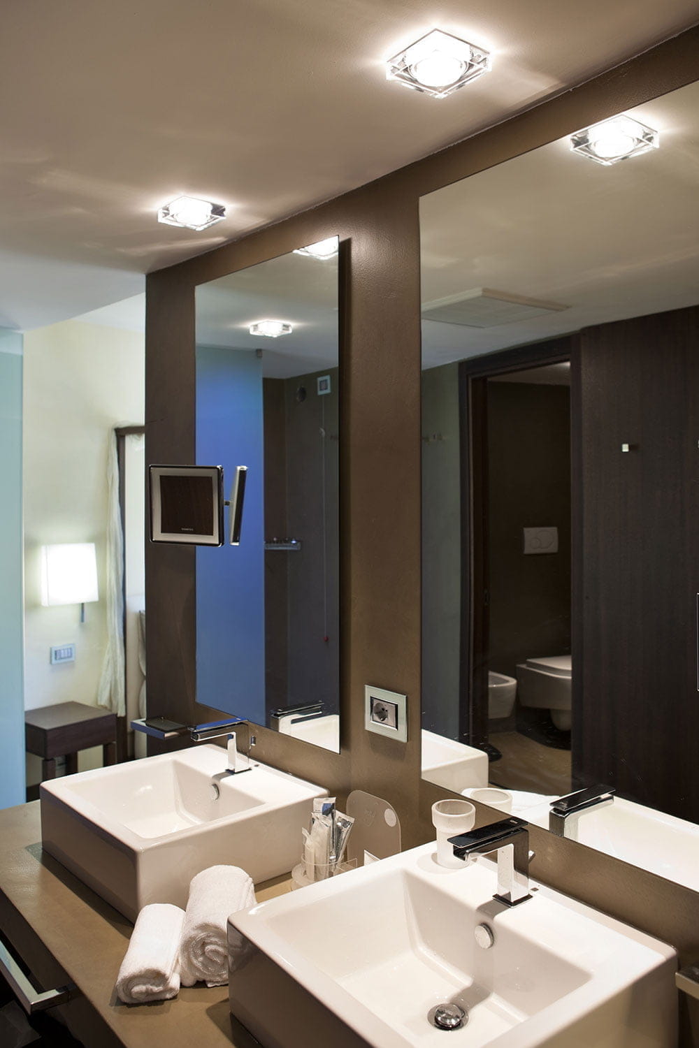 The Faretti Lui semi-recessed spotlight has a square shape, which is carefully designed in every detail. The diffuser is in transparent crystal frosted on the inside or with a polished metal plate. The light uses a halogen or integrated LED bulb and is enhanced by the high quality of the glass, which creates pleasant effects on the ceiling. Its very clean and simple design makes it suitable for all environments both in the home, in the workplace or in public life.