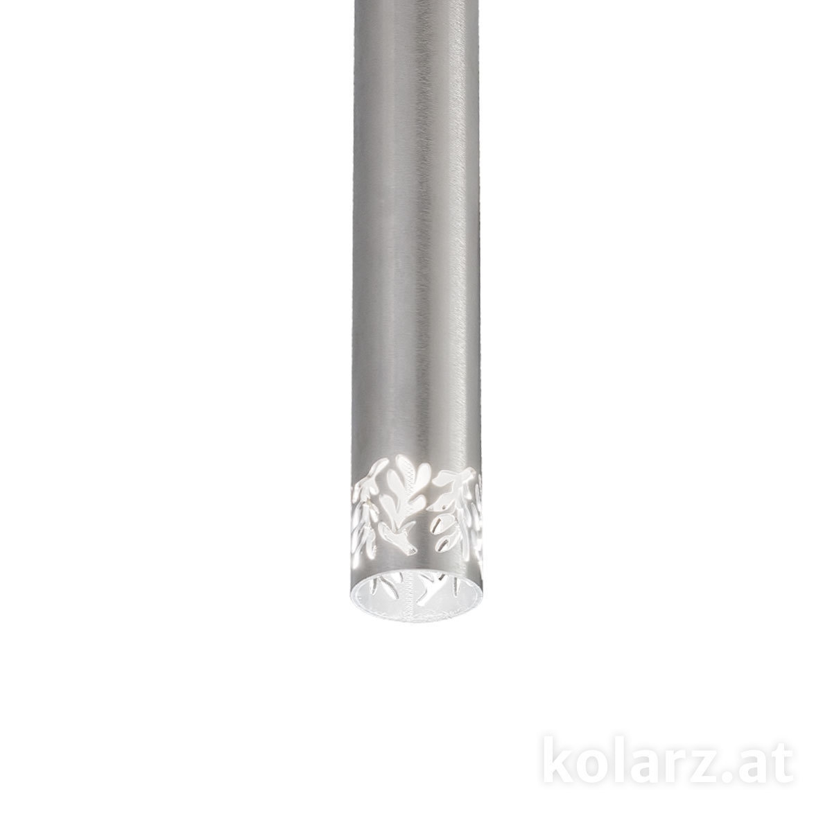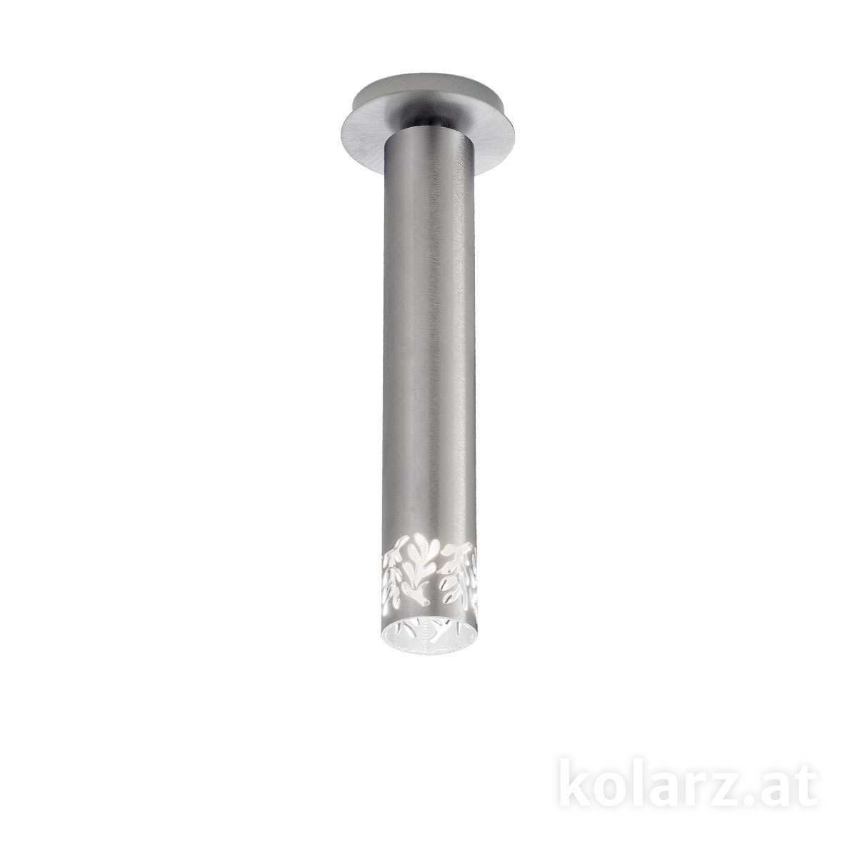 Потолочный точечный светильник с накладным креплением и вытянутым цилиндрическим корпусом, направляющим свет вниз. Модель Mobile metallo от Kolarz выполнена в хромированной отделке и имеет диаметр около 13 см при высоте 33 см, что задаёт вытянутую форму и акцент на вертикали. В нижней части корпуса расположен декоративный элемент с прорезями, через которые свет частично выходит в стороны, формируя дополнительный рисунок на поверхности. Используется один встроенный светодиодный источник с возможностью регулировки яркости, что позволяет менять интенсивность освещения в зависимости от задачи. Конструкция рассчитана на одиночную установку или группировку из нескольких светильников.