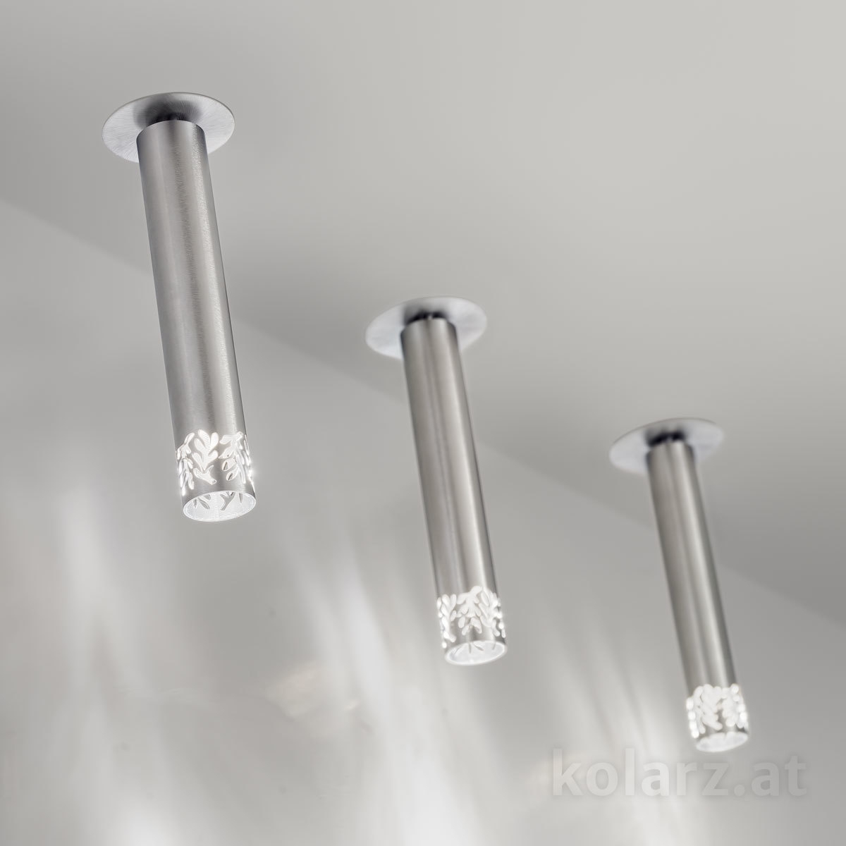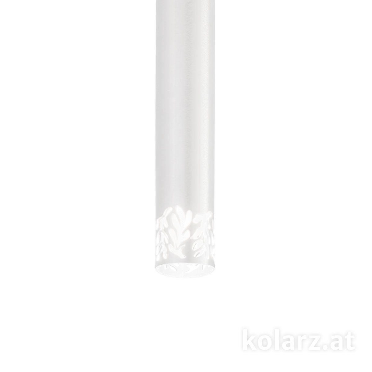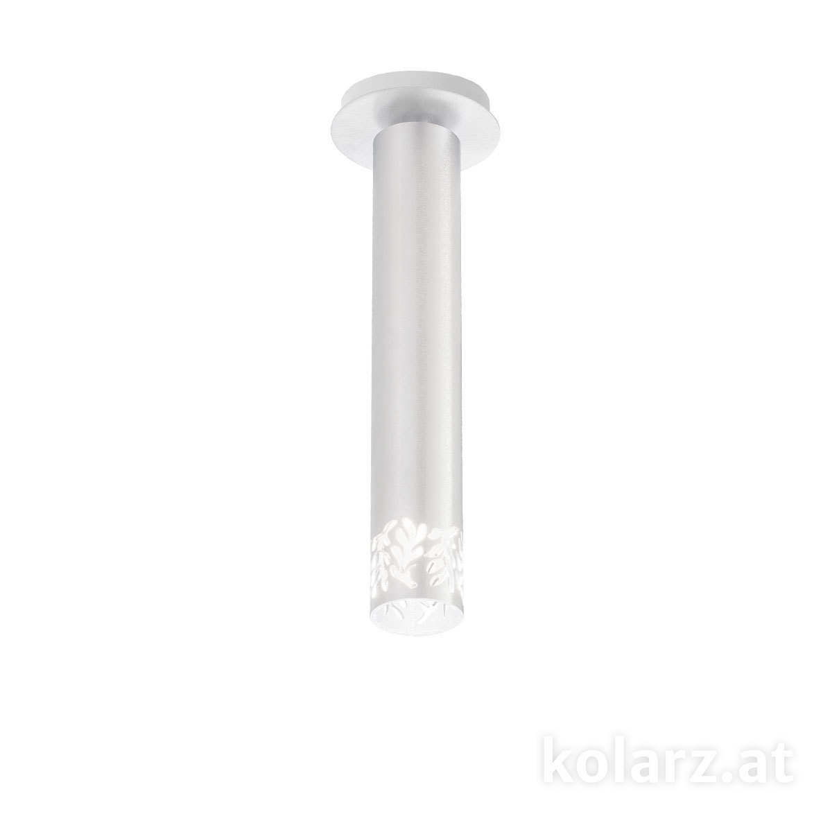 Потолочный точечный светильник с цилиндрическим корпусом, закрепляемый непосредственно на поверхность потолка. Конструкция представляет собой удлинённую трубку диаметром около 13 см и высотой 33 см, внутри которой размещён светодиодный источник света с возможностью регулировки яркости. Нижняя часть корпуса выполнена с декоративной обработкой, через которую свет выходит не только вниз, но и частично рассеивается через рисунок. Арматура выполнена из металла с матовым белым покрытием, крепление осуществляется через круглое основание. Формат подходит для локального освещения и может использоваться как одиночный элемент или в группе.