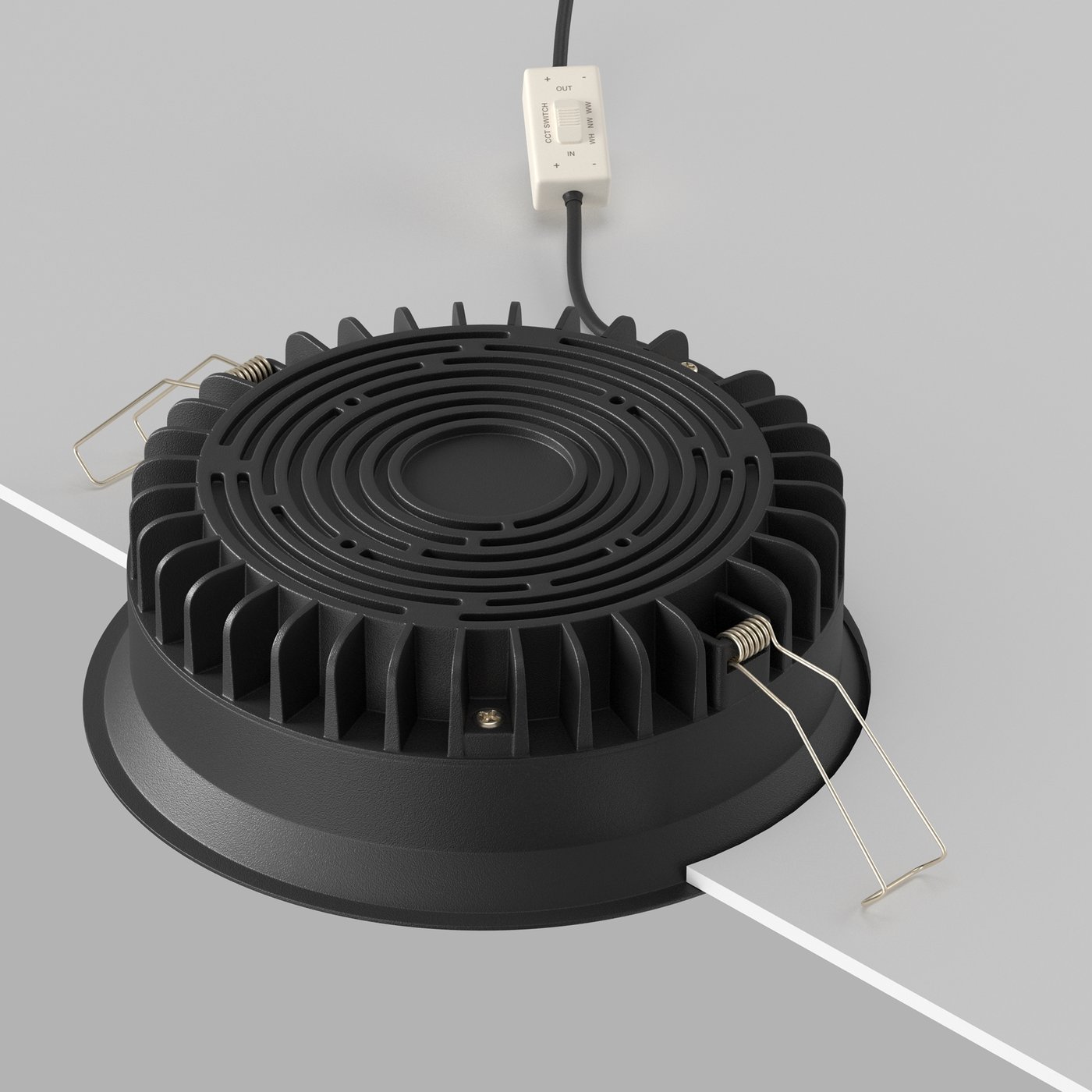 Встраиваемый даунлайт выполнен в лаконичном круглом корпусе с утопленным матовым рассеивателем и выраженными радиаторными рёбрами по периметру. В коллекции Okno от Maytoni модель рассчитана на организацию основного света: при установке в потолок поток с углом 100° равномерно распределяется по зоне под светильником, без резкого блика при взгляде снизу. Мощность 18 Вт позволяет использовать светильник как базовый источник в жилых и коммерческих помещениях, а индекс цветопередачи Ra 90 обеспечивает точное восприятие оттенков отделки и кожи. Переключатель цветовой температуры даёт выбор между 3000, 4000 и 6000 К, что позволяет настроить сценарий от тёплого домашнего до нейтрального рабочего. Степень защиты IP44 допускает монтаж в ванных комнатах и зонах с повышенной влажностью. Диаметр монтажного отверстия 150 мм и глубина 74 мм подходят для стандартных подвесных потолков.