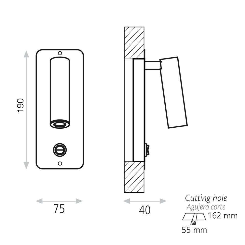 Встраиваемый настенный светильник для чтения выполнен в виде прямоугольной монтажной панели с выведенным вперёд поворотным цилиндрическим световым модулем. Корпус из металла в отделке сатинированный никель устанавливается заподлицо в стену, при этом светильник занимает около 190×75 мм по лицевой части. Световой блок наклоняется, позволяя направлять поток в нужную зону, например на книгу или рабочую поверхность. Используется встроенный светодиод мощностью 3 Вт с тёплой температурой 3000 K и световым потоком около 315 лм. Управление осуществляется кнопкой на корпусе, питание 110–240 В, степень защиты IP20.