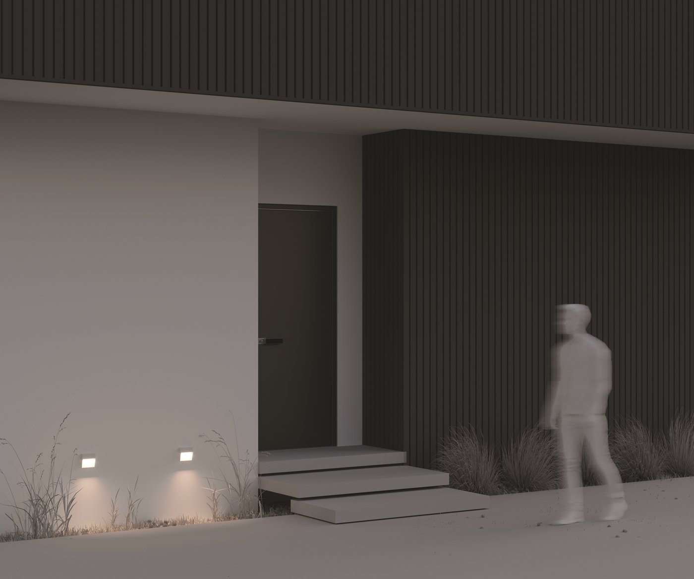 Настенная подсветка для лестницы выполнена как компактный квадратный корпус с утопленным световым окном, направленным вниз под небольшим углом, за счёт чего источник полностью скрыт от прямого взгляда. В коллекции Mane от Maytoni такая геометрия решает задачу навигационного света: светильник не освещает пространство целиком, а аккуратно подсвечивает ступень или участок дорожки перед человеком. В реальном сценарии при спуске или подъёме взгляд естественно направлен вперёд и вниз, и свет ложится именно туда, где ставится нога, не ослепляя и не создавая резких теней. Световой поток 100 лм при температуре 3000K воспринимается как мягкий ориентир, достаточный для безопасного движения в тёмное время суток без ощущения яркого освещения. Угол рассеивания около 88° позволяет равномерно подсветить поверхность ступени, а не узкую линию света. Встроенный LED-источник мощностью 3 Вт и степень защиты IP54 показывают, что светильник рассчитан на постоянную работу на улице или в неотапливаемых зонах и используется как функциональный элемент акцентного света для лестниц и дорожек.